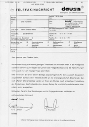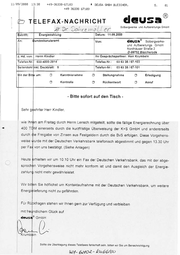 11’89/’2088 13:38 +49-36338-67183 +49 © 4 36335 DEUSA GMBH BLEICHER, 7 Dr 0%b; re2 {7 oO [ L Betrifft: n: el 67183 ELEFAX- NACHRICHT T S. Energiezahlung ejr dausa Solbergwerka und Aufbereitungs GmbH Datum: 11.09.2000 Bundeskanzleramt Von: deusa® Solbergwerke- und Aufbereitungs GmbH Nordhauser Straße 2 D-99752 Bleicherode | 2. Hd. von: Herrn Kindler Telefax-Nr.| Ihr Gesprächspartner: Herr Krumbein 030-4000-2814 Seitenzahl inkl. Deckblatt: Mit der Bitte um: 5 Telefax-Nr.: 0363 38 / 67-103 Telefon-Nr: 0363 38 / 67-101 I Kenntnisnahme I Stellungnahme I Erledigung 9 Kontrolle O Rückantwort I Anruf - Bitte sofort auf den Tisch - Sehr geehrter Herr Kindler, wie Ihnen am Freitag durch Herrn Lensch mitgeteilt, sollte die fällige Energierechnung über 400 TO M einerseits durch die kurzfristige Überweisung der KtS GmbH und andererseits durch « ie Freigabe von Zinsen aus Festgeldern durch die BvS erfolgen. Diese Vorgehens- weise wurde mit der Deutschen Verkehrsbank telefonisch abgestimmt und gegen 13.30 Uhr per Fay von uns bestätigt. (Siehe Anlagen) Heute erhielten wir um 10.10 Uhr ein Fax der Deutschen Verkehrsbank. das mit der abge- sprochen Vorgehensweise nicht mehr konform ist und damit den Ausgleich der Energ ie- zahlung nicht mehr gewährleistet. Wir bitlen Sie höflichst um Kontaktaufnahme mit der Deutschen Verkehrsbank, um weitere Energielieferung nicht zu gefährden. Für Rückfragen stehen wir Ihnen gern zur Verfügung und verbleiben mit freu ndlichem Glück auf Sollte die Übertragung dieses Telefaxes fehlerhaft sein. bitten wir Sie um Benachric htigung o 8 / 6 6 a L - R O H U B Wh-