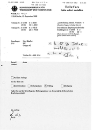 12-SEP-2008 10:05 BMUI BLNVUIC3 +49 1888 615 A +49 1888 615 5363 5363 Telefax BUNDESMINISTERIUM FÜR WIRTSCHAFT UND TECHNOLOGIE Gesch.-Z.: 5.091794 bitte sofort zustellen VIC3 11019 Berlin, 12. September 2000 Telefon Nr.: 01888 (0 30) Telefax Nr.: 01883 (0 30) 6 15-6085 Anzahl Seiten, einschl. Vorblatt: 4 20 14-6085 (Number of pages, includingthis one) 615-7010 20 14-70 10 Bei unklarem Empfangtelefonische Rückfragenan 01888 615- (0 30) 20 14- (If you have not received all pages, please call the above number) Empfänger: ” Herr Kindler Gruppe42 TelefaxNr.:40002814 | ARvVA7 E s z a N 2) v2 ea A1 if - Betreff: ° deusa (Subject) ® Auf Ihre Anfrage mit der Bitte um [_]Kenntnisnahme |_]Stellungnahme Prüfung [_]Erledigung Anbei das auf der Grundlage der Stellungnahmen von deusa und K+S überarbeitete Ergebnisprotokoll. Im Auftrag chs