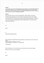 Frage 9 „Worin liegen nach Ansicht der Bundesregierung die Ursachen der existentiellen Bedrohung der DEUSA Solbergwerke und Aufbereitungs GmbH Bleicherode und mit welchen MaßR- nahmen will sie sich im Hinblick auf die o.g. Zusage des Bundeskanzlers für den Erhalt des Unternehmens und seiner Arbeitsplätze einsetzen?“ Antwort Das Unternehmen wurde von der Treuhandanstalt in 1992 privatisiert. Aus diesem Privatisierungsvertrag lassen sich keine Ansprüche gegenüber der BvS mehr herleiten. Die unternehmerische Verantwortung liegt allein bei den jetzigen Eigentümern. Gleichwohl prüft die Bundesregierung gegenwärtig, inwieweit Möglichkeiten zur Unterstützung des Unternehmens bestehen. zU. PSt D b) Chef des Bundeskanzleramtes Kleine Anfrage der Abgeordneten Gerhard Jüttemann, Rolf Kutzmutz und der Fraktion der PDS zu "Aktuelle Folgen der Kalifusion von 1993" (BT-Drucksache Nr. 14/4033) vom 31. August 2000 1 Mehrabdruck Hiermit übersende ich Ihnen einen Abdruck der Antwort auf die 0.9. Kleine Anfrage. Richtlinien der Politik sind nicht betroffen. zU. PStD