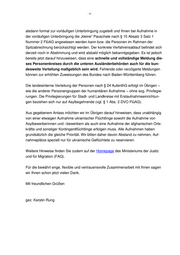 -4- alsdann formal zur vorläufigen Unterbringung zugeteilt und Ihnen bei Aufnahme in der vorläufigen Unterbringung die „kleine“ Pauschale nach § 15 Absatz 3 Satz 1 Nummer 2 FlüAG angewiesen werden kann bzw. die Personen im Rahmen der Spitzabrechnung berücksichtigt werden. Der konkrete Verfahrensablauf befindet sich derzeit noch in Abstimmung und wird alsbald möglich bekanntgegeben. Es ist jedoch bereits jetzt darauf hinzuweisen, dass eine schnelle und vollständige Meldung die- ses Personenkreises durch die unteren Ausländerbehörden auch für die bun- desweite Verteilung maßgeblich sein wird. Fehlende oder verzögerte Meldungen können zur erhöhten Zuweisungen des Bundes nach Baden-Württemberg führen. Die landesinterne Verteilung der Personen nach § 24 AufenthG erfolgt im Übrigen – wie die anderer Personengruppen der humanitären Aufnahme – ohne sog. Privilegie- rungen. Die Privilegierungen für Stadt- und Landkreise mit Erstaufnahmeeinrichtun- gen beziehen sich nur auf Asylbegehrende (vgl. § 1 Abs. 2 DVO FlüAG). Aus gegebenem Anlass möchten wir im Übrigen darauf hinweisen, dass unabhängig von einer etwaigen Aufnahme ukrainischer Flüchtlinge sowohl die Aufnahme von Asylbewerberinnen und –bewerbern als auch eine Aufnahme der afghanischen Orts- kräfte und sonstiger Kontingentflüchtlinge erfolgen muss. Alle Aufnahmen haben grundsätzlich die gleiche Priorität. Wir bitten daher davon Abstand zu nehmen, Auf- nahmeplätze speziell nur für ukrainische Geflüchtete zu reservieren. Weitere Hinweise finden Sie zudem auf der Homepage des Ministeriums der Justiz und für Migration (FAQ). Für die bewährt enge, flexible und vertrauensvolle Zusammenarbeit mit Ihnen sagen wir Ihnen schon jetzt vielen Dank. Mit freundlichen Grüßen gez. Kerstin Rung
