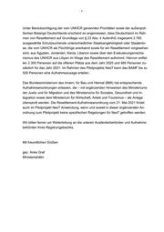-2 - Unter Berücksichtigung der vom UNHCR genannten Prioritäten sowie der außenpoli- tischen Belange Deutschlands erscheint es angemessen, dass Deutschland im Rah- men von Resettlement auf Grundlage von § 23 Abs. 4 AufenthG insgesamt 2.785 ausgewählte Schutzsuchende unterschiedlicher Staatsangehörigkeit oder Staatenlo- se, die vom UNHCR als Flüchtlinge anerkannt sowie für ein Resettlement vorgesehen sind, aus Ägypten, Jordanien, Kenia, Libanon sowie über den Evakuierungsmecha- nismus des UNHCR aus Libyen im Wege des Resettlement aufnimmt. Hiervon entfal- len 2.300 Personen auf die offenen Plätze aus dem Jahr 2020 und 485 Personen zu- sätzlich für das Jahr 2021. Im Rahmen des Pilotprojekts NesT kann das BAMF bis zu 500 Personen eine Aufnahmezusage erteilen. Das Bundesministerium des Innern, für Bau und Heimat (BMI) hat entsprechende Aufnahmeanordnungen erlassen, die – mit ergänzenden Hinweisen des Ministeriums der Justiz und für Migration und des Ministeriums für Soziales, Gesundheit und In- tegration sowie dem Ministerium für Wirtschaft, Arbeit und Tourismus – als Anlage übersandt werden. Die Resettlement-Aufnahmeanordnung vom 21. Mai 2021 findet auch im Pilotprojekt NesT Anwendung, wenn und soweit in dieser ergänzenden An- ordnung zum Pilotprojekt keine spezifischen Regelungen für NesT getroffen werden. Wir bitten ferner um Weiterleitung an die unteren Ausländerbehörden und Aufnahme- behörden Ihres Regierungsbezirks. Mit freundlichen Grüßen gez. Anke Graf Ministerialrätin