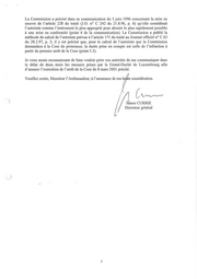 La Commission a pr&cise dans sa communication du 5 juin 1996 concernant la mise en oeuvre de l’article 228 du traite (J.O. n° C 242 du 21.8.96, p. 6) qu’elle consid6rait l’astreinte comme l’instrument le plus appropri& pour aboutir le plus rapidement possible ä une mise en conformite (point 4 de la communication). La Commission a publie la methode de calcul de l’astreinte pr&vue a l’article 171 du trait& au Journal officiel n° C 63 du 28.2.97, p. 2; il y est precise que, pour le calcul de l’astreinte que la Commission demandera ä la Cour de prononcer, la dur&e prise en compte est celle de l’infraction & partir du premier arr&t de la Cour (point 3.2). Je vous serais reconnaissant de bien vouloir prier vos autorit&s de me communiquer dans le delai de deux mois les mesures prises par le Grand-Duche de Luxembourg afın d’assurer l’ex&cution de l’arr&t de la Cour du 8 mars 2001 preecite. Veuillez croire, Monsieur l’Ambassadeur, ä l’assurance de ma hatte consid£ration. James CURRIE Directeur general