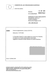 COMISIÖON DE LAS COMUNIDADES EUROPEAS aan nen Syn Ku SECRETARIA GENERAL -9 -07- 2064 Bruselas, Amp SG-Gresterzooapı 02763 REPRESENTACION PERMANENTE DE ESPANA ANTE LA UNION EUROPEA Boulevard du Rögent, 52-54. 1000 - BRUXELLES Asunto: Carta de emplazamiento, Articulo 228 TCE. Infracciön n° 1997/2069. La Secretaria General le remite adjunta una carta de la Comisiön, en relaciön con el asunto anteriormente mencionado, rogändole la transmita al Sefior Ministro de Asuntos Exteriores Dar al Canratamın (Ianaral . Anexo: C(2004) 2450 Commission europ&enne - Despacho: BREY 13/82, B-1049 Bruxelles - Belgica Europese Commissie - Despacho: BREY 13/82 - B-1049 Brussel - Belgica Tel&fono linea directa: 00-32-(0)2-295.75.94; centralita: 00-32-(0)2-299.11.11. Telefax: 00-32-(0)2-296.66.55. http://europa.eu.in/comm/secretariat general