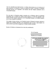 Una vez conocidas esas observaciones o si dichas observaciones no se le envian en el plazo prescrito, la Comisiön se reserva el derecho de emitir, si procede, el dictamen motivado previsto en el apartado 2 del articulo 228 del Tratado constitutivo de la Comunidad Europea. Por otra parte, la Comisiön recaba la atenciön de su Gobierno sobre las sanciones pecuniarias que el Tribunal de Justicia puede imponer, en virtud del apartado 2 del articulo 228 del Tratado constitutivo de la Comunidad Europea, a un Estado miembro que no haya cumplido su sentencia. Con arreglo al mismo articulo, si la Comisiön recurre al Tribunal de Justicia, indicarä el importe que considere adecuado a las circunstancias para la suma a tanto alzado o la multa coercitiva que deba ser pagada por el Estado miembro afectado. Reciba, Sr. Ministro, el testimonio de mi mäs alta consideraciön. Por la Comisiön Miembro de la Comisiön u CERTIFICADO CONFORME CON LA DECISIÖN Zu ADOPTADA POR LA COMISIÖN Por el Secretario Generäl, nn Director de Secretaria