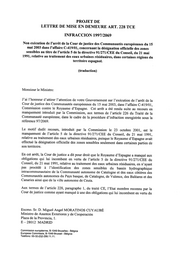 PROJET DE LETTRE DE MISE EN DEMEURE ART. 228 TCE INFRACCION 1997/2069 Non exe&cution de l’arr&t de la Cour de justice des Communautös europeennes du 15 mai 2003 dans l’affaire C-419/01, concernant la designation officielle des zones sensibles au titre de P’article 5 de la directive 91/271/CEE du Conseil, du 21 mai 1991, relative au traitement des eaux urbaines residuaires, dans certaines regions du territoire espagnol. (traduction) Monsieur le Ministre: J’ai l’honneur d’attirer l’attention de votre Gouvernement sur l’execution de l’arr&t de la Cour de justice des Communautes europ&ennes du 15 mai 2003, dans l’affaire C-419%01, Commission contre le Royaume d’Espagne. Cet arröt a &t& rendu suite au recours en manquement introduit par la Commission, aux termes de l’article 226 du Traite de la Communaute europeenne, dans le cadre de la procedure d’infraction enregistree sous la reference 97/2069. Le motif dudit recours, introduit par la Commission le 23 octobre 2001, est le manquement de l’article 5 de la directive 91/271/CEE du Conseil, du 21 mai 1991, relative au traitement des eaux urbaines residuaires, puisque le Royaume d’Espagne avait effectue la designation officielle des zones sensibles seulement dans certaines parties de son territoire. En cet arr&t, la Cour de justice a dit pour droit que le Royaume d’Espagne a manqu& aux obligations qui lui incombent en vertu de l’article 5 de la directive 91/271/CEE du Conseil, du 21 mai 1991, relative au traitement des eaux urbaines rösiduaires, en n’ayant pas procede a l’identification des zones sensibles du bassin hydrographique intracommunautaire de la Communaut& autonome de Catalogne et des eaux cötieres des Communautes autonomes du Pays basque, de Catalogne, de Valence, des Baleares et des Canaries ainsi que de la ville autonome de Ceuta, Aux termes de l’article 228, paragraphe 1, du trait& CE, l’Etat membre reconnu par la Cour de justice comme ayant manque ä une des obligations qui lui incombent en vertu du Excmo. Sr. D. Miguel Angel MORATINOS CUYAUBE Ministro de Asuntos Exteriores y de Cooperaciön Plaza de la Provincia, 1. E-28012 MADRID Commission europ&enne, B-1049 Bruxelles - Belgica Europese Commissie, B-1049 Brussel - Belgica Tel&fono: 00-32-(0)2-299.11.11.
