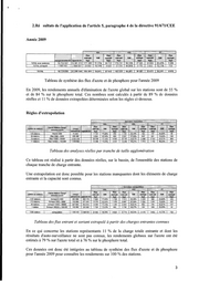 2.Ré sultats de l'application de l'article 5, paragraphe 4 de la directive 91/671/CEE Année 2009 "'""-'•'itteti,' ,::,,,,. ^<,Mx "'»'m^'M»: ^m:L .:„„w ■^¿¡T'-Kļī^^ji Flux ■ * * ■ ■ : ^ rit« ; TOTAL avec analyses В Й Ш Й Ш Й Ш Е Н iS813ÖCÍté EH 16 753 567 19 381 215 enti .mt 171 399 , »Ä 51,74% . soltam :: ' I M P 82 722 eiitism 170751 1 Ч:.· ***; 84,19% Ш!.27 001 .UÈ; 22 650 L-iJÉÉS'i 85,49% 3 286 TOTAL extrapolé 1 985 491 2 9Ū8 931 23 092 78,70% 4 920 22 774 86,04% 3 179 3 022 75,73% 733 I TOTAL Į 18 739 058 122 290 146 | 194 491 | 54,94% | 87 642 | 193 525 | 84,40% | 30 181 | 25 672 | 84,34% | 4 019 | Tableau de synthese des flux d'azote et de phosphore pour l'année 2009 En 2009, les rendements annuels d'élimination de l'azote global sur les stations sont de 55 % et de 84 % sur le phosphore total. Ces nombres sont calculés à partir de 89 % de données réelles et 11 % de données extrapolées déterminées selon les règles ci-dessous. Règles d'extrapolation - Λ' 'r: :.3tóriMśee ιηββΕί*3& ¡.i...,., ■'2:ΜίΐΜ:,·:χ-%.}(, ■: -"Wte i.·;.·. ' ! '*ЧЙК. ; : : ■ ,; лг" штт:.-.-л ¡ШйШ l y j i l p ř e í i e s A r t i H i i l I P ¡вп1гап11^^в ! Щр|::|; gjjįjįį ¡¿¡.■Κ* enti ant :,;..'. " * § '■: »ļļllB ■: т и " ' ' · ^siliíä'::: ашй.,' ■Sstóŕ r.'ÊEÈï 126 statlons Réel 0-1999 71 04S 1 125 77,00% 259 1 105 85,38% 162 147 66,66% 49 99 stations Réel 2000 - 9999 436 488 5 064 82,44% 889 5 007 87,58% 622 651 76,92% 150 79 statlons Réel 10000 - 9 9 9 9 9 2 253 229 20 538 77,15% 4 692 20185 83,61% 3 308 2 763 83,01% 469 11 statlons Réel 1 0 0 0 0 0 - 1 9 9 000 1 459 883 13 288 73,43% 3 531 13 296 89,37% 1 414 1 755 86,05% 245 Tableau des analyses réelles par tranche de taille agglomération Ce tableau est réalisé à partir des données réelles, sur le bassin, de l'ensemble des stations de chaque tranche de charge entrante. Une extrapolation est donc possible pour les stations manquantes dont les éléments de charge entrante et la capacité sont connus. : -;ЯЖЛ :~ S ^ i É A s вхИШ§« ■ .^-i-ām'! V ' : ■ : ■ * . * ! . ' '' -'4::«L. . Al ' ■"- ■■" ^ *mi:л·:··^,, : '■■ЛИ,,. ř ИВ* Clagíe,st8ílonsěřiafsp S""H«*:,; letifere íle staţiiti:: s entranieMWH entrant '' И,:|Л. : centrant 1p si s entrant ÍníŕarjWEH; б Щ К » 6 Н kal "'::'::::':::::"':/ 1 1157 stations Extrapol 0-1999 482 886 958170 7 646 77,00% 1 759 "atom7 513 . 85,38% 1 099 998 66,66% 333 172 statlons Extrapol 2 0 0 0 - 9 9 9 9 705 000 877 945 8179 82,44% 1 436 8 087 87,58% 1 004 1 051 76,92% 242 26 stations extrapol 10000-99999 607 60S 852 616 5 538 77,15% 1 265 5 443 83,61% 892 745 83,01% 127 1 statlon Extrapol 100000 - 1 9 9 999 190 000 220 000 1 729 73,43% 460 1 730 89,37% 164 228 86,05% 32 Į 1356 statlons f" extrapolation 1 985 491 2 908 931 23 092 Tableau des flux entrant et sortant extrapolé à partir des charges entrantes connues En ce qui concerne les stations représentants 11 % de la charge totale entrante et dont les résultats d'auto-surveillance ne sont pas connus, les rendements globaux sur l'azote ont été estimés à 79 % sur l'azote total et à 76 % sur le phosphore total. Ces données ont donc été intégrées au tableau de synthèse des flux d'azote et de phosphore pour l'année 2009 pour connaître les rendements sur 100 % des stations.
