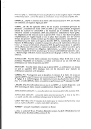 A. POINT SUR LES 30 STATIONS DE TRAITEMENT DES EAUX USEES DONT LA DEMONSTRATION DE LA CONFORMITE N'A PAS ETE APPORTEE EN JUIN 2010 Le classement est opéré par département. En bleu les stations qui sont dorénavant conformes, en vert celles qui restent à mettre en conformité : CHAUNY (02) : Une nouvelle station a été mise en eau le 20 juin 2010. Les résultats de juillet et août démontrent déjà que les performances sont atteintes TERGNIER (02) : Une nouvelle station a été mise en eau le 24 septembre 2010. Il n'y a pas encore de données pour démontrer que les performances sont atteintes ROMILLY SUR SEINE (10) : Une nouvelle station d'épuration a été mise en eau en septembre 2008. Suite à un conflit entre l'exploitant et le constructeur le traitement du phosphore n'est opérationnel que depuis mars 2010. CABOURG (14) : Une nouvelle station est opérationnelle depuis fin 2009. Suite à un conflit entre l'exploitant et le constructeur le traitement du phosphore n'est opérationnel que depuis mars 2010. TROU VILLE SUR MER (14) : Une nouvelle station de 115 000 Eh a été mise en eau en décembre 2009. La phase d'essai n'a mis en place l'injection du phosphore à plein régime qu'en juillet 2010. Les performances d'août montrent que globalement sur l'année on sera sans problème sous les 2 mg/1 en concentration. Sur 8 mois on est à 2,2 mg/1 EVREIJX (27) : La nouvelle station est en travaux et sera mise en eau au plus tard le 31/12/2011. Le chantier suit son court. Une déphosphatation partielle est déjà opérationnelle sur l'ancienne station. VAL DE REUIL (27) : La nouvelle station a été mise en eau en novembre 2009. Les données sur les performances des 7 premiers mois 2010 montrent qu'elle fonctionne correctement PIB RAC (31) : Cette station a été supprimée en mai 2010 et les effluents raccordés sur la nouvelle station de Seilh dont le rejet est en Garonne donc en zone normale. Cette station est en observation mais les performances fournies sur août 2010 démontrent qu'elle respecte ses obligations réglementaires ΜΕΖΕ LOUPIAN (34) : La nouvelle station est en construction. Le chantier a pris du retard suite à des problèmes financiers avec le constructeur. Mise en place d'un traitement par boues activées avec traitement azote et phosphore complété par un traitement bactériologique dans les lagunes. Elle sera mise en eau fin mars 20'11. VITRY LE FRANCOIS (51) : Une nouvelle station a été mise en eau en octobre 2009. Les performances sur les 7 premiers mois de 2010 démontrent que la station fonctionne parfaitement