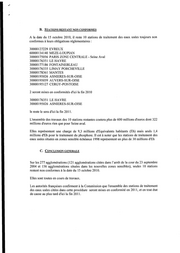 В. STATIONS RESTANT NON CONFORMES A la date du 15 octobre 2010, il reste 10 stations de traitement des eaux usées toujours non conformes à leurs obligations réglementaires : 30000127229 EVREUX 60000134140 MEZE-LOUPIAN 30000175056 PARIS ZONE CENTRALE - Seine Aval 30000176351 LE HAVRE 30000177186 FONTAINEB LEAU 30000176335 LIMAY PORCHEVILLE 30000178361 MANTES 30000195026 ASNIERES-SUR-OISE 30000195039 AUVERS-SUR-OISE 30000195127 CERGY-PONTOISE 2 seront mises en conformités d'ici la fin 2010 30000176351 LE HAVRE 30000195026 ASNIERES-SUR-OISE le reste le sera d'ici la fin 2011. L'ensemble des travaux des 10 stations restantes coûtera plus de 600 millions d'euros dont 322 millions d'euros rien que pour Seine aval. Elles représentent une charge de 9,3 millions d'Equivalents habitants (Eh) mais seuls 1,4 millions d'Eh pour le traitement du phosphore. Il est à noter que les stations de traitement des eaux usées situées en zones sensible échéance 1998 représentent un plus de 30 millions d'Eh C. C O N C L U S I O N G E N E R A L E Sur les 277 agglomérations (121 agglomérations citées dans l'arrêt de la cour du 23 septembre 2004 et 156 agglomérations situées dans les nouvelles zones sensibles), seules 10 stations restent non conformes à la date du 15 octobre 2010. Elles sont toutes en cours de travaux. Les autorités françaises confirment à la Commission que l'ensemble des stations de traitement des eaux usées citées dans cette procédure seront mises en conformité en 2011, et en tout état de cause au plus tard d'ici la fin 2011.