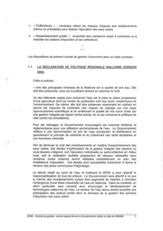 11. « Collecteurs » : conduites reliant les r&seaux d’&gouts aux emplacements prevus ou pr&visibles pour r&aliser l'!&puration des eaux uses. 12. « Assainissement public » : ensemble des on6rations visant a construire ou ä exploiter les stations d'&puration et les collecteurs. * * * Les dispositions du present contrat de gestion s’inscrivent dans un triple contexte : 1.1. LA _DECLARATION DE POLITIQUE REGIONALE WALLONIE HORIZON 2004. Celle-ci precise : « Une des principales richesses de la Wallonie est la qualit& de son eau. Elle ‚ doit ötre preservee, ceux qui la polluent doivent en assumer le coüt. Un des elements capital pour pröserver l’eau est la mise en place progressive d’une agriculture dont les modes de production sont eux aussi, respectueux de l’environnement. De mäme, elle doit &tre pr&servee notamment en mettant en ceuvre les mesures de protection des nappes de captage sur une base rigoureusement scientifique et en ameliorant la qualit& de nos cours d’eau par une gestion int&gree par bassin (entre autres, en ce qui concerne la politique de lutte contre les inondations). Pour les menages, le Gouvernement encouragera les mesures tarifaires et röglementaires pour une utilisation parcimonieuse de l’eau. Le Gouvernement veillera a une harmonisation du prix de l’eau (production et distribution) en garantissant le principe de solidarit& et en pröservant des tarifs &quitables et une fourniture minimale. Afin de diminuer le coüt des investissements en matiere d’assainissement des eaux usees, des Etudes d’optimisation de la gestion integree des bassins ou sous-bassins intögrant, soit l’&puration individuelle ou semi-collective en milieu rural, soit la re&alisation partielle progressive de reseaux seEparatifs dans certaines zones urbaines seront r&alis6es pr&alablement au plan des installations d’&puration. Ces &tudes sont susceptibles d’entrainer a terme la r6vision des plans communaux d’ögouttage. Le decret relatif au cycle de l’eau et instituant la SPGE a pour objectif la responsabilisation de tous les acteurs. Le Gouvernement sera attentif a ce que le rythme des investissements puisse ötre augmente de maniere & favoriser ’emergence d’une filiere industrielle de ’eau en Wallonie. Dans ce contexte, un effort particulier sera consenti pour encourager le d6eveloppement de technologies wallonnes de l’eau. Le secteur de l’eau devra rendre possible une participation des acteurs prives dans le domaine de la gestion des services d’epuration des eaux us&es. SPGE - Contrat de gestion -version approuvee par le Gouvernement wallon en date du 03/02/00 4