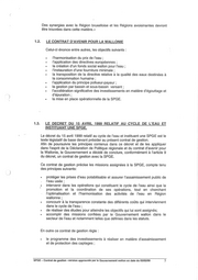 Des synergies avec la Region bruxelloise et les Regions avoisinantes devront ötre trouvees dans cette matiere.» 1.2. LE CONTRAT D’AVENIR POUR LA WALLONIE Celui-ci &nonce entre autres, les objectifs suivants : °e I’'harmonisation du prix de l’eau ; . Tapplication des directives europ&ennes ; «e la creation d’un fonds social wallon pour l’eau ; ° l'instauration d’une fourniture minimale ; ° la transposition de la directive relative A la qualit& des eaux destindes A la consommation humaine ; ° Tl'application du principe pollueur-payeur ; ° la gestion par bassin et sous-bassin versant ; . l'acceleration significative des investissements en mati@re d’egouttage et d’epuration ; e la mise en place op6&rationnelle de la SPGE. 1.3. LE DECRET DU 15 AVRIL 1999 RELATIF AU CYCLE DE L’EAU ET INSTITUANT UNE SPGE. Le decret du 15 avril 1999 relatif au cycle de l’eau et instituant une SPGE est le texte legislatif de base devant presider au present contrat de gestion. Afin de poursuivre les principes contenus dans ce decret et de les appliquer dans l’esprit de la Declaration de Politique rögionale et du contrat d’avenir pour la Wallonie, le Gouvernement a decide de conclure, conformement A l’article 9 du decret, un contrat de gestion avec la SPGE. Ce contrat de gestion pr&cise les missions assignees A la SPGE, compte tenu des principes suivants: ° _proteger les prises d’eau potabilisable et assurer l’assainissement public de l’eau usee ; e intervenir dans les op6rations qui constituent le cycle de l’eau ainsi que la “promotion et la coordination de ses op6rations, tout en cherchant ’optimalisation et l’harmonisation des activitss de l’eau en Region wallonne ; °e _concourir A la transparence constante des differents coüts qui interviennent dans le cycle de l’eau ; « de realiser des etudes pour atteindre les objectifs qui lui sont assignds; °. accomplir des missions confi&es par le Gouvernement wallon dans le secteur de l’eau et notamment telles que definies dans les statuts. En outre ce contrat de gestion r&gle:: ° le programme des investissements a realiser en matiere d'assainissement et de protection des captages ; SPGE - Contrat de gestion -version approuvee par le Gouvernement wallon en date du 03/02/00 5