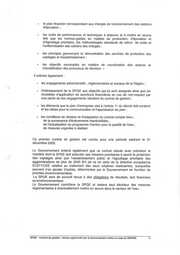 « le plan financier correspondant aux charges de fonctionnement des stations d'epuration ; ° les outils de performances et techniques ä &Elaborer et A mettre en oeuvre tels que les normes-guides en matiere de production, d'&puration et d’'Egouttage prioritaire, les m&thodologies standards de calcul de coüts et l'uniformisation des cahiers des charges ; « les principes gouvernant la r&muneration des services de protection des captages et d'assainissement ; « les objectifs escompt6s en matiere de coordination des acteurs et d’acceleration des processus de decision. » I| pr&cise &galement : « les engagements administratifs , r&glementaires et sociaux de la Region ; « linteressement de la SPGE aux objectifs qui lui sont assignes ainsi que les modalites d’application de sanctions financieres en cas de non-respect par une partie de ses engagements rösultant du contrat de gestion ; « les el&ments que le plan d’entreprise vise A l'article 11 du decret doit contenir et les delais pour la communication et l'approbation du plan ; + les conditions de revision et d'adaptation du contrat compte tenu : de la survenance d'&venements impr6visibles ; de l'actualisation du programme d'action pour la qualit& de l'eau ; de mesures urgentes & realiser. Ce premier contrat de gestion est conclu pour une periode expirant le 31 d&cembre 2005. Le Gouvernement entend &galement que ce contrat stipule avec precision la maniere dont la SPGE doit ex&cuter ses missions prioritaires A savoir la protection des captages ainsi que l’assainissement public et l’&gouttage prioritaire des agglomerations de plus de 2000 EH (et ce en vertu de la directive europdenne 91/271/CEE relative au traitement des eaux urbaines residuaires), auxquelles peuvent s’en ajouter d’autres, determinees par le Gouvernement en fonction de priorites environnementales. La SPGE sera de surcroit tenue & des obligations de rösultats, tant financiers qu’environnementaux. Le Gouvernement contrölera la SPGE et restera seul d&cideur des mesures röglementaires ä &ventuellement mettre en oeuvre dans le secteur de l’eau. N SPGE - Contrat de gestion -version approuvee par le Gouvernement wallon en date du 03/02/00 6