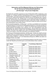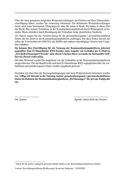 Über die oben genannten möglichen Weiterentwicklungen, die Einfluss auf diese Datenschutz- einwilligung haben, werden Sie rechtzeitig informiert. Die definierten Weiterentwicklungen treten nach einer bestimmten Übergangszeit ohne Ihr zutun in Kraft. Sie haben in dieser Zeit das Recht, Ihre weitere Teilnahme an der Kommunikationsplattform durch Widerspruch zu be- enden. Ihnen entstehen durch Beendigung der Teilnahme keine dienstlichen Nachteile. Als Nutzer tragen Sie die Verantwortung für die personenbezogenen / personenbeziehbaren Daten, die Sie direkt in die Kommunikationsplattform einbringen. Für diese Daten müssen Sie selbst die Vorschriften der DSGVO, des BDSG und anderer einschlägiger Gesetze und Vorga- ben einhalten. Sie können Ihre Einwilligung für die Nutzung der Kommunikationsplattform jederzeit gegenüber dem IT-Dienstleister BWI formlos ohne Angabe von Gründen per E-Mail an „bwi.fp.BwMessenger@bwi.de“ oder durch Löschen Ihres Accounts im IntranetBw Self- Service-Portal widerrufen. Mit dem Widerruf werden Sie umgehend von der Teilnahme an der Kommunikationsplattform ausgeschlossen. Die der Bundeswehr und dem IT-Dienstleister BWI zugänglichen über Sie vor- 3 handenen personenbezogenen Daten werden umgehend gelöscht. Nachdem ich oben über die Nutzungsbedingungen und mein Widerrufsrecht informiert worden bin, willige ich hiermit in die Nutzung meiner personenbezogenen / personenbeziehbarer Daten im Rahmen der Kommunikationsplattform „BwMessenger“ für private Endgeräte ein. ___________________ ___________________________ Ort, Datum digitale Unterschrift des Nutzers 3 Durch Sie für andere zugänglich gemachte Inhalte bleiben in der Kommunikationsplattform erhalten. Version: Einwilligungserklärung BwMessenger für private Endgeräte – 29/10/2020