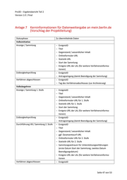 Pro3D – Ergebnisbericht Teil 2 Version 1.0 | Final Anlage 7 Kerninformationen für Datenweitergabe an mein.berlin.de (Vorschlag der Projektleitung) Statusphase Zu übermittelnde Daten Volksinitiative Anzeige / Sammlung - EreignisID - Titel - Gegenstand / wesentlicher Inhalt - Onlineformular-URL - Statistik-URL - Start der Sammlung - Ereignis-URL der LAL (für weitere Verfahrensinforma- tionen) Zulässigkeitsprüfung - EreignisID - Antragseingang (damit Beendigung der Sammlung) Verfahren abgeschlossen - EreignisID - Tag des Verfahrensabschlusses (zur Archivierung) Volksbegehren Anzeige / Sammlung 1. Stufe - EreignisID - Titel - Gegenstand / wesentlicher Inhalt - Onlineformular-URL für 1. Stufe - Statistik-URL für 1. Stufe - Start der Sammlung - Ereignis-URL der LAL (für weitere Verfahrensinforma- tionen) Zulässigkeitsprüfung - EreignisID - Antragseingang (damit Beendigung der Sammlung) Durchführung VB / Sammlung 2. Stufe - EreignisID - Titel - Gegenstand / wesentlicher Inhalt - ggf. Gesetzentwurf-URL - Onlineformular-URL für 2. Stufe - Statistik-URL für 2. Stufe - Sammlungszeitraum für Unterstützungserklärungen (erste Datum Start der Sammlung, zweites Datum Beendigungsdatum) - Ereignis-URL der LAL (für weitere Verfahrensinforma- tionen Verfahren abgeschlossen - EreignisID Seite 47 von 53