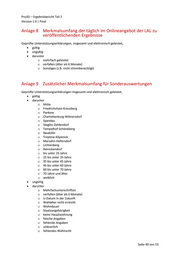 Pro3D – Ergebnisbericht Teil 2 Version 1.0 | Final Anlage 8 Merkmalsumfang der täglich im Onlineangebot der LAL zu veröffentlichenden Ergebnisse Geprüfte Unterstützungserklärungen, insgesamt und elektronisch geleistet, · gültig · ungültig · darunter o mehrfach geleistet o verfallen (älter als 6 Monate) o Sonstiges (z.B. nicht stimmberechtigt) Anlage 9 Zusätzlicher Merkmalsumfang für Sonderauswertungen Geprüfte Unterstützungserklärungen insgesamt und elektronisch geleistet, · gültig · darunter o Mitte o Friedrichshain-Kreuzberg o Pankow o Charlottenburg-Wilmersdorf o Spandau o Steglitz-Zehlendorf o Tempelhof-Schöneberg o Neukölln o Treptow-Köpenick o Marzahn-Hellersdorf o Lichtenberg o Reinickendorf o bis unter 25 Jahre o 25 bis unter 35 Jahre o 35 bis unter 45 Jahre o 45 bis unter 60 Jahre o 60 bis unter 70 Jahre o 70 Jahre und älter o weiblich · ungültig · darunter o Mehrfachunterschriften o verfallen (älter als 6 Monate) o U-Datum in der Zukunft o Wahlalter nicht erreicht o Wohndauer o Staatsangehörigkeit o keine Hauptwohnung o falsche Angaben o fehlende Angaben o unleserlich o fehlendes Wahlrecht Seite 49 von 53