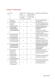 Anlage 12 Risikoanalyse lfd. Risiko Bedeutung für das Eintrittswahrschein- Maßnahme zur Risikoabschirmung Nr. Projekt lichkeit zum Zeitpunkt A = sehr wichtig der Beauftragung B = wichtig 1 = hoch, 2 = mittel C = nicht wichtig 3 = gering 1 Kostenrisiko Antrag auf Mittelübertragung/ B 3 Zeitverzögerung Nachfinanzierung 2 Kostenrisiko grds. Prüfung und Bewertung einer allgemeine C 3 sinnvollen Projektfortführung sowie Haushaltsrestriktionen ggf. Antrag auf Nachfinanzierung 3 Personelles Risiko Aufnahme des Risikos in mtl. fehlende Kapazitäten Statusbericht, wegen Großwahlereignis A 2 verlagern von nicht zwingend notwendigen Umsetzungsaktivitäten auf späteren Zeitpunkt 4 Technologische Risiken Problem muss ggf. mit verstärkter Onlineausweisfunktion A 3 Kapazität gelöst werden; essenziell für Erklärungsabgabe für Start 5 Technologische Risiken Problem muss ggf. durch funktionelle Schnittstellen übergangsweise händische Lösung B 3 für Informationstransfer erfolgen oder eine Realisierung zu einem späteren Zeitpunkt erfolgen 6 Technologische Risiken zielgruppengerechte und einfache Akzeptanz und Nutzung Information über Verfahren und A 2 durch die Bevölkerung Verfahrenssicherheit, „Komparsentest“ 7 Fachliche Risiken Prozesse und technische oder Abweichen von organisatorische Lösungen müssen A 3 Ergebnissen der ggf. überarbeitet werden Voruntersuchung 8 Terminliche Risiken Ein Eingriff in den Beratungsprozess Verabschiedung A 2 des Abgh ist nicht angezeigt. gesetzlicher Änderungen 9 Terminliche Risiken Es sind allgemeine organisatorische Einschränkungen Mittel zur Kompensation der B 2 aufgrund von Corona- Einschränkungen zu nutzen. Schutzmaßnahmen Seite 53 von 53