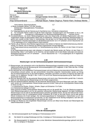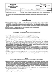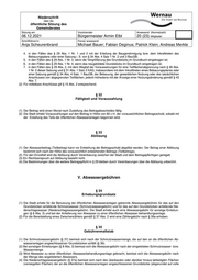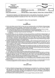 Niederschrift über die öffentliche Sitzung des Gemeinderates Sitzung am Vorsitzender Anwesend (Normalzahl) 06.12.2021 Bürgermeister Armin Elbl 20 (23) Mitglieder Schriftführer/in Ferner anwesend Anja Scheurenbrand Michael Bauer; Fabian Deginus; Patrick Klein; Andreas Merkle (3) Unbeschadet des § 2 des Haftpflichtgesetzes haftet die Stadt nur für Vorsatz oder grobe Fahrlässigkeit. § 45 Haftung der Grundstückseigentümer Die Grundstückseigentümer und die Benutzer haften für schuldhaft verursachte Schäden, die infolge einer unsachgemäßen oder den Bestimmungen dieser Satzung widersprechenden Benutzung oder infolge eines mangelhaften Zustands der Grundstücksentwässerungsanlagen entstehen. Sie haben die Stadt von Ersatzansprüchen Dritter freizustellen, die wegen solcher Schäden geltend gemacht werden. § 46 Ordnungswidrigkeiten (1) Ordnungswidrig im Sinne von § 142 Abs. 1 GemO handelt, wer vorsätzlich oder fahrlässig 1. entgegen § 3 Abs. 1 das Abwasser nicht der Stadt überläßt; 2. entgegen § 6 Absätze 1, 2 oder 4 von der Einleitung ausgeschlossene Abwässer oder Stoffe in die öffentlichen Abwasseranlagen einleitet oder die vorgeschriebenen Höchstwerte für einleitbares Wasser überschreitet; 3. entgegen § 8 Abs. 1 Abwasser ohne Vorbehandlung oder Speicherung in öffentliche Abwasseranlagen einleitet; 4. entgegen § 8 Abs. 2 fäkalienhaltiges Abwasser ohne ausreichende Vorbehandlung in öffentliche Abwasseranlagen einleitet, die nicht an eine öffentliche Kläranlage angeschlossen sind; 5. entgegen § 8 Abs. 3 sonstiges Wasser oder Abwasser, das der Beseitigungspflicht nicht unterliegt, ohne besondere Genehmigung der Stadt in öffentliche Abwasseranlagen einleitet; 6. entgegen § 12 Abs. 1 Grundstücksanschlüsse nicht ausschließlich von der Stadt herstellen, unterhalten, erneuern, ändern, abtrennen oder beseitigen läßt; 7. entgegen § 15 Abs. 1 ohne schriftliche Genehmigung der Stadt eine Grundstücksentwässerungsanlage herstellt, anschließt oder ändert oder eine öffentliche Abwasseranlage benutzt oder die Benutzung ändert; 8. die Grundstücksentwässerungsanlage nicht nach den Vorschriften des § 16 und des § 17 Abs. 3 herstellt; 9. entgegen § 18 Abs. 1 die notwendige Entleerung und Reinigung der Abscheider nicht rechtzeitig vornimmt; 10. entgegen § 18 Abs. 3 Zerkleinerungsgeräte für Küchenabfälle, Müll, Papier und dergleichen oder Handtuchspender mit Spülvorrichtungen an seine Grundstücksentwässerungsanlagen anschließt; 11. entgegen § 21 Abs. 1 die Grundstücksentwässerungsanlage vor der Abnahme in Betrieb nimmt. (2) Ordnungswidrig im Sinne von § 8 Abs.2 Satz 1 Nr.2 KAG handelt, wer vorsätzlich oder leichtfertig den Anzeigepflichten nach § 43 Abs. 1 bis 7 nicht, nicht richtig oder nicht rechtzeitig nachkommt. (3) Die Vorschriften des Landesverwaltungsvollsteckungsgesetzes bleiben unberührt. VII. Übergangs- und Schlussbestimmungen § 47 Inkrafttreten (1) Soweit Abgabeansprüche nach dem bisherigen Satzungsrecht bereits entstanden sind, gelten anstelle dieser Satzung die Satzungsbestimmungen, die im Zeitpunkt des Entstehens der Abgabeschuld gegolten haben. (2) Diese Satzung tritt am 1. Januar 2022 in Kraft. (3) Die Satzung über die öffentliche Abwasserbeseitigung (Abwassersatzung) vom 12.12.2011, zuletzt geändert durch die Beschlüsse vom 21.10.2013, 30.11.2015, 27.11.2017 und 04.11.2019 tritt zum 31.12.2021 außer Kraft. Hinweis nach § 4 Abs. 4 Gemeindeordnung für Baden-Württemberg Eine etwaige Verletzung der Verfahrens- oder Formvorschriften der Gemeindeordnung für Baden-Württemberg oder auf- grund der Gemeindeordnung beim Zustandekommen dieser Satzung wird nach § 4 der Gemeindeordnung unbeachtlich, wenn sie nicht schriftlich innerhalb eines Jahres seit Bekanntmachung dieser Satzung gegenüber der Stadt Wernau (Neckar) geltend gemacht worden ist. Der Sachverhalt, der die Verletzung begründen soll, ist zu bezeichnen. Dies gilt