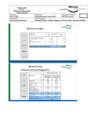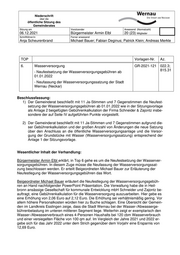Niederschrift über die öffentliche Sitzung des Gemeinderates Sitzung am Vorsitzender Anwesend (Normalzahl) 06.12.2021 Bürgermeister Armin Elbl 20 (23) Mitglieder Schriftführer/in Ferner anwesend Anja Scheurenbrand Michael Bauer; Fabian Deginus; Patrick Klein; Andreas Merkle TOP Vorlagen-Nr. Az. 6. Wasserversorgung GR-2021-121 022.3; 815.31 - Neufestsetzung der Wasserversorgungsgebühren ab 01.01.2022 - Neufassung der Wasserversorgungssatzung der Stadt Wernau (Neckar) Beschlussfassung: 1) Der Gemeinderat beschließt mit 11 Ja-Stimmen und 7 Gegenstimmen die Neufest- setzung der Wasserversorgungsgebühren ab 01.01.2022 wie in der Sitzungsvorlage als Anlage 2 beigefügten Gebührenkalkulation der Firma Schneider & Zajontz insbe- sondere der auf Seite IV aufgeführten Punkte vorgestellt. 2) Der Gemeinderat beschließt mit 11 Ja-Stimmen und 7 Gegenstimmen aufgrund die- ser Gebührenkalkulation und der großen Anzahl von Änderungen die neue Satzung über den Anschluss an die öffentliche Wasserversorgungsanlage und die Versor- gung der Grundstücke mit Wasser (Wasserversorgungssatzung) entsprechend der Anlage 1 der Sitzungsvorlage. Wesentlicher Inhalt der Verhandlung: Bürgermeister Armin Elbl erklärt, in Top 6 gehe es um die Neufestsetzung der Wasserver- sorgungsgebühren. In diesem Zuge müsse die Neufassung der Wasserversorgungssat- zung beschlossen werden. Er erteilt Beigeordneten Michael Bauer zur Erläuterung der Neufestlegung der Wasserversorgungsgebühren das Wort. Beigeordneter Michael Bauer erläutert die Neufestlegung der Wasserversorgungsgebüh- ren an Hand nachfolgender PowerPoint Präsentation. Die Verwaltung habe die in Heil- bronn ansässige Gesellschaft für kommunale Entwicklung mbH Schneider und Zajontz be- auftragt, eine Gebührenkalkulation für die Wasserversorgung auszuarbeiten. Hier gebe es eine Erhöhung von 2,06 Euro auf 2,12 Euro. Die Erhöhung sei verhältnismäßig gering. Vor allem höhere Personalkosten würden hier zu Buche schlagen. Eine Übersicht der Gemein- den im Landkreis Esslingen zeige, dass die Stadt Wernau bei der Wasser-/Abwasserge- bührenbelastung im unteren mittleren Segment liege. Weiterhin zeigt er exemplarisch den Wasser-/Abwasserverbrauch eines 4-Personen Haushalts bei 120 cbm Wasserverbrauch und einer versiegelten Fläche von 100 qm auf. Im Vergleich der Jahre 2021 und 2022 er- gebe sich für das Jahr 2022 unter dem Strich gegenüber dem Vorjahr eine Ersparnis von 12,69 Euro.