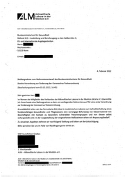Stellungnahme zum Referentenentwurf des Bundesministeriums für Gesundzeit Erste Verordnung zur Änderung der Coronavirus-Testverordnung (Bearbeitungsstand vom 03.02.2022, ·16.45) Artikel 1 Änderung der Coronavirus-Testverordnung Zu Nr. 5; Stellungnahme: Der ALM e.V. begrüßt es ausdrücklich, dass die Bestätigung eines positiven SARS-CoV-2-Antigen- Testbefundes sowie die variantenspezifische PCR-Testung über den unter Nr. 6 eingeführten § 6 Absatz· 5 weiterhin möglich ist. Aus fachärztlicher Sicht sollte die generelle Empfehlung einer bestätigenden Testung ausschließlich über die hierfür etablierten undfachlich besonders geeigneten Strukturen erfolgen. Wie in anderen Bereichen der Testverordnung sehen wir es daher als erforderlich an, dass die fachlichen Empfehlungen seitens des Robert Koch-Institutes ausgesprochen werden. Formulierungshilfe: ·a) In Satz 1 werden nach dem Wort „SARS-CoV-2" ein Komma und folgende Wörter eingefügt: ,,sofern das Robert Koch-Institut eine bestätigende Testung empfohlen wird". Zu Nr. 6: Stellungnahme: Die in § 6 Absatz 5 eingefügte Regelung beinhaltet entgegen unserer Empfehlungen aus der Stellungnahme vom 19. Januar 2022. n·ach wie vor eine allgemeine, nicht weitergehend konkretisierte prioritäre Untersuchung .von Probenmaterialien von Beschäftigten in Krankenhäusern, stationären Pflegeeinrichtungen und Einrichtungen der Eingliederungshilfe sowie ambulanten Pflegediensten und Diensten der Eingliederungshilfe mit der PCR-Methode auf das Vorhandensein von SARS-CoV-2. Hinzugekommen sind jetzt auch die Beschäftigten aus Arztpraxen und über den Begründungstext auch Beschäftigte, die nur vorübergehend in den unter Nr. 1 bis 5 genannten Einrichtungen tätig sind. Diese Regelung ist abzulehnen, da sie weit über die bisherigen Ankündigungen des Bundesministers für Gesundheit, dass ausschließlich die Testungen zur vorzeitigen Beendigung. der Isolierung von den vorgenannten Beschäftigten vorrangig in den medizinischen Laboratorien zu bearbeiten sein sollen, hinausgehen. Zudem entspricht die Formulierung nicht dem in der Verordnung genannten Ziel, nämlich die priorisierte Probenbearbeitung von Körpermaterial von Beschäftigten mit direktem Kontakt zu besonders vulnerablen Personengruppen sicherzustellen. Im Übrigen sieht die Beschlusslage der MPK vom 07.01.2022 und die durch das RKI vorgenommene Konkretisierung der Kontaktpersonennachverfolgung auch nur für die vorzeitige· Bee9digung der Isolierung von Beschäftigten in den hier genannten Bereichen eine verpflichtende PCR-Untersuchung vor. Alle übrigen Fälle können mit zertifizierten SARS-CoV-2-Antigentesten untersucht werden. Seite 2 von 4