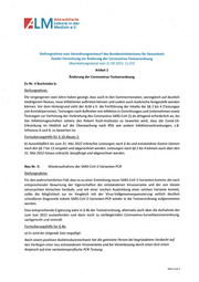 Stellungnahme zum Verordnungsentwurf des Bundesministeriums für Gesundzeit zweite Verordnung zur Änderung der Coronavirus-Testverordnung (Bearbeitungsstand vom 21.03.2022, 11:47) Artikel 1 Änderung der Coronavirus-Testverordnung Zu Nr. 4 Buchstabe b: Stellungnahme: Die vergangenen zwei Jahre haben gezeigt, dass auch in den Sommermonaten, wenngleich auf deutlich niedrigerem Niveau, neue Infektionen auftreten können und zudem auch Ausbrüche festgestellt werden können. Vor dem Hintergrund sieht der ALM e.V. die Fortführung der Inhalte der§§ 2 bis 4 (Testungen von Kontaktpersonen, Testungen nach Auftreten von Infektion in Einrichtungen und Unternehmen sowie Testungen zur Verhütung der Verbreitung des Coronavirus SARS-CoV-2) als dringend erforderlich an, bis das Infektionsgeschehen seitens des Robert Koch-Institutes so bewertet wird, dass die Covid-19- Erkrankung im Hinblick auf die Überwachung nach lfSG wie andere Infektionserkrankungen, z.B. Influenza A und B, zu bewerten ist. Formulierungshilfe für§ 18 Absatz 2: b} Ausschließlich bis .zum 31. Mai 2022 erbrachte Leistungen nach § 4a und entstandene Kosten können nach den§§ 7 bis 13 vergütet und abgerechnet werden. Leistungen nach§§ 2 bis 4 können auch über den 31. Mai 2022 hinaus erbracht, beauftragt und abgerechnet werden. Neu Nr. 5: Wiederaufnahme der SARS-CoV-2-Varianten-PCR Stellungnahme: Für den wahrscheinlichen Fall, dass es zu einer Entstehung neuer SARS-CoV-2-Varianten kommt, die nach entsprechender Bewertung der Eigenschaften der entstandenen Virusvariante und der von diesen verursachten klinischen Verlä'ufe, und mit einer raschen Ausbreitung einer solchen Variante kommt, sollte die Möglichkeit zur im Vergleich mit der Virus-Vollgenomsequenzierung zeitlich deutlich schnelleren Diagnostik mittels SARS-CoV-2-Varianten-PCR wieder in die Testverordnung aufgenommen werden. Eine entsprechende Ergänzung wäre in § 4b der Testverordnung, alternativ auch über die Aufnahme der zum Juni 2022 auslaufenden und dann noch zu verlängernden Coronavirus-Surveillanceverordnung, sachgerecht und sinnvoll: Formulierungshilfe für§ 4b: a) Es wird der folgende Satz angefügt: Nach einem positiven Nukleinsäurenachweis hat die getestete Person bei begründetem Verdacht auf das Vorliegen einer neu entstandenen Virusvariante und bei Veranlassung durch einen Arzt einen Anspruch auf eine variantenspezifische PCR-Testung. Seite 2 von 3