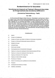 - 5- Bearbeitungsstand: 22.11.2020 16:fO Uhr Bundesministerium für Gesundheit Verordnung zum Anspruch auf Testung in Bezug auf einen direk- ten Erregernachweis des Coronavirus SARS-CoV-2 (Coronavirus-Testverordnung -TestV) Vom 2020 Auf Grund des § 20i Absatz 3 Satz 2 Nummer 1 Buchstabe 2 und Nummer 2, Satz 3, 4, 7, sowie 10 bis 12 des Fünften Buches Sozialgesetzbuch, der durch Artikel 4 Nummer 1 des Dritten Gesetzes zum Schutz der Bevölkerung bei einer epidemischen Lage von natio 0 naler Tragweite vom 18. November 2020 (BGBI. 1 S: 2397) neugefasst worden ist, und auf Grund § 24 Satz 3 Nummer 2 und Satz 4 und 5 des Infektionsschutzgesetzes, der durch Artikel 1 Nummer 15 des Dritten Gesetzes zum Schutz der Bevölkerung bei einer epidemi- schen Lage von nationaler Tragweite vom 18. November 2020 (BGBI. 1S. 2397) neugefasst worden ist, verordnet das Bund~sministerium für Gesundheit nach Anhörung des Spitzen- verbandes Bund der Krankenkassen, der Kassenärztlichen Bundesvereinigung und des Verbands der Privaten Krankenversicherung: Inhaltsübersicht §1 Anspruch §2 T estungen von Kontaktpersonen §3 Testungen von Personen nach Auftreten von· Infektionen in Einrichtu!lgen und Unternehmen §4 Testungen zur Verhütung der Verbr6iturig des Coronavirus SARS-CoV-2 §5 Häufigkeit der Testungen §6 Leistungserbringung §7 Abrechnung der Leistungen §8 Verwaltungskostenersatz der Kasse'närztlichen Vereinigungen §9 Vergütung von Leistungen der Labordiagnostik mittels-Nukleinsäurenachweis (PCR-Test) § 10 Vergütung von· Leistungen der Labordiagnostik mittels Antigen-Test § 11 Vergütung von Sachkoste.n für PoC-Antigen-Te_sts § 12 Vergütung von weiteren ärztlichen Leistungen § 13 Finanzierung von Testzentren § 14 Verfahren für die Zahlung aus der Liquiditätsreserve des Gesundheitsfonds § 15 Transparenz § 16 Labordiagnostik durch Zahnärzte und Tierärzte § 17 Inkrafttreten, Außerkrafttreten