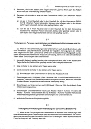 -7- Bearbeitungsstand: 22.11.2020 16:1 O Uhr 5. Personen, die in den letzten zehn Tagen durch die „Corona-Warn-App" des. Robert Koch-Institutes eine Warnung erhalten haben, . · 6. Personen, die Kontakt zu einer mit dem Coronavirus SARS-CoV-2 infizierten Person hatten, a) die sie in ihrem Haushalt oder in dem Haushalt der mit dem Coronavirus SARS- CoV-2 infizierten Person, behandeln, betreuen oder pflegen oder in den letzten zehn Tagen behandelt, betreut oder gepflegt haben, oder b) von der sie in ihrem Haushalt oder in dem Haushalt der mit dem Coronavirus SARS-CoV-2 infizierten Person behandelt, betreut oder gepflegt werden oder in den letzten zehn Tagen behandelt, betreut oder gepflegt wurden. §3 Testungen von Personen nach Auftreten von Infektionen in Einrichtungen und Un- ternehmen (1) Wenn in oder von Einrichtungen oder Unternehmen nach Absatz 2 von diesen oder vom öffentlichen Gesundheitsdienst außerhalb der regulären Versorgung in den letzten zehn Tagen eine mit dem Coronavirus SARS-CoV-2 infizierte Person festgestellt wurde, haben asymptomatische Personen Anspruch auf Testung, wenn sie in oder von betroffenen Teilen dieser Einrichtungen oder Unternehmen 1. behandelt, betreut, gepflegt werden oder untergebracht sind oder in den letzteri zehn Tagen behandelt, betreut oder gepflegt wurden oder untergebracht waren, 2. tätig sind oder in den letzten zehn Tagen waren oder 3. sonst anwesend sind oder in den letzten zehn Tagen waren. (2) Einrichtungen oder Unternehmen im Sinne des Absatzes 1 sind: 1. Einrichtungen nach§ 23 Absatz 3 Satz 1 Nummer 1 bis 1Ound 12 des Infektionsschutz- gesetzes, Vorsorge- und Rehabilitationseinrichtungen auch dann, wenn dort keine den Kranken.häusern vergleichbare medizinische Versorgung erfolgt, 2. Einrichtungen und Unternehmen nach § 36 Absatz 1 Nummer 1 bis 6 und Absatz 2 des Infektionsschutzgesetzes, 3. Einrichtungen und Unternehmen nach.§. 23 Absatz 3 Satz 1 Nummer 11 oder § 36 Absatz 1 Nummer 7 einschließl1ch der in§ 36 Absatz 1 Nummer 7 zweiter Teilsatz des Infektionsschutzgesetzes genannten Einrichtungen und Unternehmen und 4. ambulante Dienste der Eingliederungshilfe. §4 Testungen zur Verhütung der Verbreitung des Coronavirus SARS°CoV-2 (1) Wenn es die Einrichtungen oder Unternehmen im Rahmen ihres einrichtungs- oder unternehmensbezogenen Testkonzepts oder der öffentliche Gesundheitsdienst zur Verhin- derung der Verbreitung des Coronavirus SARS-CoV-2 verlangen, haben asymptomatische Personen Anspruch auf Testung, wenn sie