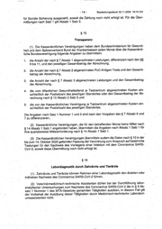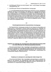 - 14 - Bearbettungsstand: 22.11.2020 16:10 Uhr für Soziale Sicher ung aus gez ahl t, sow eit die Za hlu ng noc h nic ht erf olg t ist. Fü r die Üb er- mittlungen nach Satz 1 gilt Absatz 1 Satz 2. §1 5 Transparenz (1) Die Kassenär ztli che n Ve rein igu nge n hab en dem Bu nde sm inis ter ium für Ge sun d- heit und dem Spitzenve rba nd Bu nd der Kra nke nka sse n jed en Mo nat Ob er.d ie Ka sse när zt- liche Bundesvereinigung folgende Angaben zu übermitteln: 1. die Anzahl de r nac h.§ 7 Ab sat z 1 abg ere chn ete n Lei stu nge n, diff ere nzi ert nac h den §§ 9 bis 11, und den jeweiligen Gesamtbetrag de r Abrechnung, 2. die Anzahl der na ch § 7 Ab sat z 2 abg ere chn ete n Po C-A nU gen -Te sts und den Ge sam t-· betrag der Ab rec hnu ng, · · 3. die Anzahl der nac h § 7 Ab sat z 3 abg ere chn ete n Lei stu nge n und den Ge sam tbe tra g de r Abrechnung,· · 4, die vom öffentlichen Ge sun dhe itsd ien st je Te stz ent rum abg ere chn ete n Ko ste n ein - schließlich de r Po stle itza hl des jew eili gen Sta ndo rte s ode r den Ge sam tbe tra g de r Ab~ rechnung nach § 13 Absatz 2 Satz 5 und 5. die von der Ka sse när ztli che n Ve rein igu ng je Te stz ent rum abg ere chn ete n Ko ste n ein - schließlich der Postleitzahl des jeweiligen Standortes. Die Angab en nac h Sa tz 1 Nu mm er 1 und 3 sin d nac h den Vo rga ben des § 7 Ab sat z 6 und 7 zu differenzieren .. (2) Kassenär ztli che Ve rein igu nge n, die für den bet ref fen den Mo nat kei ne Mit tel nac h § 14 Absatz 1 Satz 1 ang efo rde rt hab en, Ob erm itte.In die An gab en nac h Ab sat z 1 Sa tz 1 für ihre quartalsweise Mittelanforderung nach § 14 Absatz 1 Satz 1. (3) Die Ka sse när ztli che n Ve rei nig ung en übe rm itte ln zud em die Da ten na ch § 10 in de r · bis zum 14. Oktober.202 0 gel ten den Fa ssu ng der Ve ror dnu ng zum An spr uch auf bes tim mte Testungen für den Na chw eis des . Vo rlie gen s ein er Infe ktio n mit dem Co ron avi rus SA RS - CoV-2, soweit diese Übermittlung noch nicht erfolgt ist. §1 6 Labordiag.nostik durch Zahnärzte und Tierärzte (1) Zahnä rzt e und Tie rär zte kön nen Ra hm en ein er Lab ord iag nos tik den dire kte n ode r indirekten Nachweis des Coronavirus SARS-CoV-2 führen .. (2) Veter inä rm edi zin isc h-t ech nis che As sis ten ten dür fen bei de r Du rch füh run g lab or- analytischer Untersuchun gen zum Na chw eis des Co ron avi rus SA RS -Co V-2 die in § 9 Ab - satz 1 Nummer 1 des MT A:G ese tze s gen ann ten Tä tigk eite n aus übe n, in die sem Fa ll gilt de r Vorbehalt d_er Ausübung die ser Tä tigk eite n dur ch Me diz inis chc tec hni sch e Lab ora tor i- um sas sis ten ten nic ht. ·