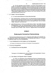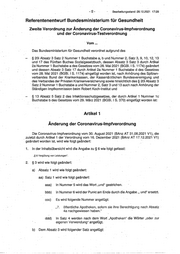 Bearbeitungsstand: 28._12.2021 17:28 ,,(2) Für die Leistungen nach § 6 Absatz 1 und 3 bis 5 und § 9 Absatz 3 und 4 erstellen die Apotheken mindestens einmal pro Monat eine Abrechnung, aus der sich die Anzahl der durchgeführten COVID-19-Schutzimpfungen und die Anzahl der erstellten COVID-19-lmpfzertifikate und die dafür geltend gemachte Vergütung ergibt. Die an das Rechenzentrum im Rahmen der Abrechnung nach Absatz 1 Satz 1 übermittelten Angaben dürten keinen Bezug zu der Person aufweisen, für die die Leistungen erbracht worden sind." . 7. § 11 Absatz 7 wird wie folgt gefasst: ,,(7) An das Bundesministerium für Gesundheit übermittelt 1. jede Kassenärztliche Vereinigung über die Kassenärztliche Bundesvereinigung zeitnah für jeden Kalendermonat die Anzahl der mit ihr abgerechneten Schutzimp- fungen soweit möglich differenziert nach deri Leistungserbringern nach§ 3 Absatz 1 Satz 1 Nummer 1 und 3 bis 6 und 2. jedes Rechenzentrum im Sinne von § 300 Absatz 2 Satz 1 des Fünften Buches Sozialgesetzbuch über die Bundesven,inigung Deutscher Apothekerverbände e. V. zeitnah für jeden Kalendermonat die Anzahl der mit ihm durch die Leistungs- erbringer nach § 3 Absatz 1 Satz 1 Nummer 7 abgerechneten Schutzimpfungen." Artikel 2 Änderung der Coronavirus-Testverordnung · Die Coronavirus-Testverordnung vom 21. September 2021 (BAnz AT 21.09.2021 V1 ), die zuletzt durch Artikel 2 der Verordnung vom 16. Dezember 2021 (BAnz AT 17.12.2021 V1) geändert worden ist, wird wie folgt geändert: 1. In der lnhaltsQbersicht wird die Angabe zu § 2 wie folgt gefasst: ,,§ 2 Testungen vo~ Kontaktpersonen und Personeh mit Voraufenthalt in Virusvariantengebieten". 2. § 2 wird wie folgt geändert: a) Die Überschrift wird wie folgt gefasst: ,,§ 2 Testungen von Kontaktpersonen und von Personen mit Voraufenthalt in Virusva- riantengebieten". b) _Dem Absatz 2 wird folgender Absatz 3 angefügt: ,, (3) Wenn vom öffentlichen Gesundheitsdienst Personen festgestellt werden, die sich zu einem beliebigen Zeitpunkt in den letzten zehn Tagen vor der Einreise in die Bundesrepublik Deutschland in einem als Virusvariantengebiet im Sinne von § 2 Nummer 3a der Coronavirus-Einreiseverordnung in der jeweils gültigen Fas- sung eingestuften Gebiet aufgehalten haben, haben diese Anspruch auf Testung. Der Anspruch nach Satz 1 besteht bis zu 14 Tage nach Einreise in die Bundesre- publik Deutschland und beschränkt sich auf eine Testung durch Leistungserbringer · nach§ 6 Absatz 1 Nummer 1."
