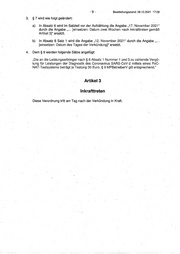 -9- Bearbeitungsstand: 28.12.2021 17:28 3. § 7 wird wie folgt geändert: a) In Absatz 6 wird im Satzteil vor der Aufzählung die Angabe ,,17. November 2021" durch die Angabe,, ... [einsetzen: Datum zwei Wochen nach Inkrafttreten gemäß Artikel 3]" ersetzt. b) In Absatz 8 Satz 1 wird die Angabe „12. November 2021" durch die Angabe,, ... [einsetzen: Datum des Tages der Verkündung]" ersetzt. 4. Dem § 9 werden folgende Sätze angefügt: ,,Die an die Leistungserbringer nach§ 6 Absatz 1 Nummer 1 und 3_zu zahlende Vergü- tung für Leistungen der Diagnostik des Coronavirus SARS-CoV-2 mittels eines PoC- NAT-Testsystems beträgt je Testung 30 Euro.§ 9 MPBetreiberV gilt entsprechend." Artikel 3 Inkrafttreten Diese Verordnung tritt am Tag nach der Verkündung in Kraft.