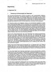 - 10 - Bearbeitungsstand: 28.12.2021 17:28 Begründung A. Allgemeiner Teil 1. Zielsetzung und Notwendigkeit der Regelungen Die Coronavirus-Krankheit02019 (COVID-19} gehört zu den ansteckendsten Infektions- . krankheiten des Menschen. Alle Bevölkerungsteile sind in Deutschland von d.er Infektion mit dem Coronavirus SARS-CoV-2 betroffen. Während für die meisten Menschen die Er- krankung mit COVID-19 mild verläuft, besteht insbesondere für bestimmte Personengrup- pen aufgrund ihres Gesundheitszustandes und/oder Alters ein erhöhtes Risiko für•einen schweren oder tödlichen COVID-19-Krankheitsverlauf (vulnerable Personengruppen). Zur Prävention stehen gut verträgliche, sichere und hochwirksame Impfstoffe zur Verfü- gung. Schutzimpfungen gegen COVID-19 schützen nicht nur die geimpfte Person wirksa.m vor einer Erkrankung und schweren Krankheitsverläufen (Individualschutz), sondern sie re- duzieren gleichzeitig erheblich die Weiterverbreitung der Krankheit in der Bevölkerung (Be- völkerungsschutz). Bei geimpften Personen sinkt also sowohl das Risiko einer asymptoma- tischen Infektion, als auch das Übertragungsrisiko in den Fällen, in denen es trotz Impfung zu einer Infektion kommt. Von einem reduzierten Übertragungsrisiko profitieren insbeson- dere vulnerable Personen, da eine Schutzimpfung gerade bei älteren und immunsuppri- mierten Personen nicht immer eine Erkrankung verhindert. · Aufgrund der derzeit bestehenden sehr hohen Nachfrage nach Auffrischungsimpfungen, aber auch der wieder steigenden Nachfrage nach Erst- und Zweitimpfungen ist eine schnelle Organisation und Durchführung der Schutzimpfungen notwendig._ Die Ständige Impfkommission beim Robert Koch-Institut (STIKO) empfiehlt seit dem 21. Dezember 2021, dass die Auffrischungsimpfung mit einem mRNA-lmpfstoff für Personen ab 18 Jahren be- reits ab dem vollendeten 3. Monat nach Abschluss der Grundimmunisierung verabreicht werden kann. Die Gesundheitsministerkonferenz hat dies am 22. Dezember 2021 ange- sichts des vorherrschenden Infektionsgeschehens und im Hinblick auf die Omikron-Vari- ante ausdrücklich begrüßt. · Zudem wurde mit der Änderung der CoronalmpfV vom 16. Dezember 2021 in§ 1 Absatz 2 geregelt, dass eine von der Zulassung abweichende Verabreichung der COVID-19-lmpf- stoffe erfolgen kann, wenn sie nach dem Stand der Wissenschaft medizinisch vertretbar ist. Auch dann besteht bei Eintritt eines Impfschadens ein Anspruch auf Ver-sorgung nach dem lfSG. Um den großen Bedarf nach Impfungen bestmöglich und auch perspektivisch zu decken, wurde mit dem durch das Gesetz zur Stärkung der Impfprävention gegen COVID-19 und zur Änderung weiterer Vorschriften im Zusammenhang mit der COVID-19-Pandemie vom 10._Dezember 2021 (BGBI. 1 S. 516~) neu in das ln~~ktionsschutzgesetz (lfSG) eingefügten § 20b geregelt, dass zusätzlich zu Arztinnen und Arzten ausnahmsweise auch Zahnärzte und Zahnärztinnen, Tierärzte und Tierärztinnen sowie Apotheker und Apothekerinnen zur Durchführung von Schutzimpfungen gegen das Coronavirus SARS-CoV-2 unter bestimm- ten Voraussetzungen als eigenständige Leistungserbringer im Sinne dieser Verordnung für einen vorübergeheriden Zeitraum berechtigt sind. Die sich hieraus ergebenden Anpassungen der CoronalmpfV werden durch diese Ände- . rungsverordnung vollzogen; dies betrifft in einem ersteh. Schritt die Apothekerinnen und Apotheker, da die damit verbundenen technischen Fragen insbesondere bezüglich der lmpfsurveillance vergleichsweise zügig umgesetzt werden können.·
