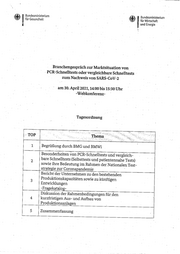 ~ 1 Bundesministe. rium Wit~ I fü .m _ . Bundesministerium r Gesundheit ~~ 1. für Wirtschaft und Energie B r a n c h e n g e sp r ä c h z u r M a r k ts it u a ti o n v o n . P C R -S c h n e ll te st s o d e r v e r g le ic h b a r e S c h n e ll te st s z u m N a c h w e is v o n SARS-CoV-2 a m 30. April 2021, 14:00 b is 15:30 U h r -W e b k o n fe r e n z - T a g e so r d n u n g TOP Thema 1 Begrüßung d u rc h BMG u n d BMWi Besonderheiten v o n PCR-Schnelltests u n d vergleich- bare Schnelltests (Selbsttests u n d p a ti e n te n n a h e Tests) 2 sowie ihre Bedeutung im Rahmen der N a ti o n a le n Test- strategie z u r Coronapandemie Bericht der U n te rn e h m e n zu d e n b e st e h e n d e n Produktionskapazitäten sowie zu künftigen 3 Entwicklungen -Fra ekatalog- Diskussion der R a h m e n b e d in g u n g e n für d e n 4 kurzfristigen Aus- u n d Aufbau von Produktionsanlagen 5 Zusammenfassung