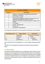 FR Bundesministerium vos für Familie, Senioren, Frauen u und Jugend 0 Allgemeine und übergreifende Angelegenheiten des Ministeriums a Verfassung und Verwaltung BEEEEE BEE Familie, Kinder und Jugend Bürgerschaftliches Engagement, Selbsthilfe, Freiwilligendienste, Wohl- fahrtspflege, Kriegsfolgenhilfe, Freizeit und Tourismus Sozialwesen, Menschen mit Behinderung, Migration, Flüchtlinge, Asyl, In- tegration Be Se TSemiren =Atere Menschen I 8 | @ieiosteung. Chaneenglihhen Jede Hauptgruppe des Aktenplans wird unter thematischen Gesichtspunkten weiter untergliedert. el Hauptgruppe Verfassung und Verwaltung Akten werden auf der Ebene der Betreffseinheit, d. h. auf der niedrigsten Gliederungsstufe gebil- det. Jede Akte wird von der Registratur mit Aktenzeichen und Aktenbezeichnung („Aktenbetreff“) erfasst. 5.1 Aktenzeichen Die Vergabe von Aktenzeichen erfolgt nach den hier vorgegebenen Regeln zur Bildung und Kenn- zeichnung von Akten. Grundsätzlich wird ein Aktenzeichen gebildet, indem an das vierstellige Ak- tenplankennzeichen der Betreffseinheit eine Ordnungsnummer (fortlaufende Nummer) angefügt und mit einem Schrägstrich abgetrennt wird. Ein Aktenzeichen muss mindestens aus Aktenplan- kennzeichen und Ordnungsnummer bestehen, die Angabe des Aktenplankennzeichens allein ist nicht ausreichend. o®
