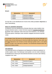 und Jugend FR Bundesministerium vos für Familie, Senioren, Frauen _ Beispiel: 1106/000 Sprachkurse allgemein 1106/001 Sprachkurse Englisch 1106/002 Sprachkurse Französisch Die erste Akte zu einer Betreffseinheit (lfd. Nummer 000) enthält grundsätzlich Allgemeines zu dieser Themenstellung. Bildung von „abgeleiteten“ Aktenzeichen Die Menge der unter einer Betreffseinheit zu führenden Akten kann weitere inhaltliche Unter- teilungen erforderlich machen, in diesem Fall können sogenannte abgeleitete Betreffseinhei- ten gebildet werden. Ableitungen werden immer durch einen Bindestrich (-) vom Aktenplan- kennzeichen getrennt. Ableitungen werden verbindlich vorgegeben oder können frei gewählt werden. Freie Ableitungen Freie Ableitungen können vom Rejgistrator/von der Registratorin im Rahmen der geltenden Vor- schriften vergeben werden. Freie Ableitungen werden gebildet, wenn eine weitere Unterteilung der Betreffseinheit zur Wahrung der Übersichtlichkeit erforderlich ist und keine „feste“ Ableitung vorgegeben ist bzw. passt. 1106 — 01/001 Sprachkurse Englisch 1106 - 01/002 Sprachkurse Französisch 1106 - 01/003 Sonstige Sprachkurse