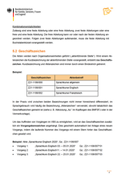 und Jugend FR Bundesministerium vos für Familie, Senioren, Frauen u Kombinationsmöglichkeiten Zulässig sind eine feste Ableitung oder eine freie Ableitung, zwei feste Ableitungen oder eine freie und eine feste Ableitung. Die freie Ableitung kann vor oder nach der festen Ableitung an- geordnet werden. Folgen zwei feste Ableitungen aufeinander, muss die feste Ableitung mit Buchstabenkürzel vorangestellt werden. 5.2 Geschäftszeichen Die Akten werden nach Organisationseinheiten geführt („aktenführende Stelle“). Wird einem Ak- tenzeichen die Kurzbezeichnung der aktenführenden Stelle vorangestellt, entsteht das Geschäfts- zeichen. Kurzbezeichnung und Aktenzeichen sind immer durch einen Bindestrich getrennt. Beispiel: Z21-1106/000 Sprachkurse allgemein Z21-1106/001 Sprachkurse Englisch Z21-1106/002 Sprachkurse Französisch In der Praxis wird zwischen beiden Bezeichnungen nicht immer hinreichend differenziert, im Sprachgebrauch wird häufig die Bezeichnung „Aktenzeichen“ verwendet, obwohl tatsächlich das Geschäftszeichen gemeint ist (siehe z. B. Abkürzung „Az.“ im Kopfbogen des BMFSFJ oder in der Vermerkvorlage). Um das Auffinden von Vorgängen im VBS zu ermöglichen, wird an das Geschäftszeichen zusätz- lich ein Vorgangskennzeichen angehängt. Dies geschieht automatisch bei Anlage eines neuen Vorgangs, indem die laufende Nummer des Vorgangs mit einem Stern hinter das Geschäftszei- chen gesetzt wird. Beispiel: Akte „Sprachkurse Englisch 2020“, Gz.: Z21-1106/007 e Vorgang 1: „Sprachkurs Englisch 03. — 05.01.2020 Gz.: Z21-1106/007*01 «e Vorgang 2: „Sprachkurs Englisch11.— 14.01.2020“ Gz.: Z21-1106/007*02 e Vorgang 3: „Sprachkurs Englisch 22. — 25.01.2020“ Gz.: Z21-1106/007*03 vo®