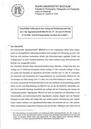 RUHR-UNIVERSITAT BOCHUM Fakultät für Philosophie, Pädagogik und Publizistik Institut für Pädagogik Professor Dr. Joachim H. Knoll | Gutachtliche Äußerung zu dem Antrag auf Indizierung nach GjS, Art. 1 der Jugendzeitschrift BRAVO, Nr. 37 - 44 vom 8.9.1994 bis . 27.10.1994, "Jeweils Fotogeschichte 'Im Bann des Teufels''". Zur Zeitschrift: Die kommerzielle Jugendzeitschrift' BRAVO ist in den vergangenen Jahren kaum Gegen- stand von durchgeführten Indizierungsverfahren oder Anträgen auf Indizierung gewesen. Das Blatt hat sich durchaus wechselnden Moden und Zeiterscheinungen angepaßt, freilich das "Erfolgsrezept" ist relativ konstant geblieben: dazu sollen zunächst einige Informationen eher formaler Art vorangestellt werden. | Die Zeitschrift, Heinrich Bauer Spezialzeitschriftenverlag, München, verfügt heute über eine Auflage von 1,5 Millionen Exemplaren (Druck-Auflage 1,5 Mio, verkaufte Auflage 1,4 Mio), sie wendet sich erkennbar an Jugendliche und Kinder zwischen dem 12. und 16. Lebensjahr, die Zeitschrift stellt hinsichtlich der Lesegewohnheiten ein transitorisches Medium dar, die Verweildauer am Blatt beträgt etwa 2 % Jahre, die Leser-Blatt-Bindung ist intensiv, in frühe- ren Zeiten, als politische Wochenzeitschriften noch eine erhebliche Gemeindebildung gestiftet haben, ist die Leser-Blatt-Bindung von BRAVO nur von der des SPIEGEL übertroffen wor- den. Die Zeitschrift übersteigt hinsichtlich der Auflage und der Verbreitung das Gesamt der "nichtkommerziellen" Jugendpresse. BRAVO ist nicht nur quantitativ der Marktführer in der kommerziellen und nicht-kommerziellen Jugendpresse, sondern rangiert auch im Bekannt- heitsgrad an erster Stelle und verfügt über eine weithin positive Attribuierung unter Jugend- . lichen. Andere Anbieter von Jugendzeitschriften haben sich entweder auf vor- oder nachlau- fende Alterskohorten eingerichtet (Poprocky etwa auf die über 15jährigen) oder haben sich im Die Unterscheidung von kommerziellen und nichtkommerziellen Jugendzeitschriften, die sich weniger am Preis und eher an den Vertriebswegen orientiert, ist heute in der publizistikwissenschaftlichen Zeitungskunde wegen der geringen Schärfe kaum mehr gebräuchlich. Wir haben dagegen schon frühzeitig Bedenken vorgebracht: J. H. Knoll, Jugendzeitschriften im Videozeitalter, Sachsenheim 1985.