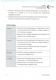 Anlage 5 Dienstanweisung zur Dokumentation und Aktenführung #zumVorgang im Auswärtigen Dienst 4. Besondere Vorkommnisse zeigt die Registraturleitung Referat 103 oder Referat 121 unverzüglich an, je nachdem, ob es sich um personelle oder organisatorische Angelegenheiten handelt. 5. Die Registraturleitung hat eine Team-Führungsaufgabe, für deren Wahrnehmung die Teilnahme an entsprechenden Führungsseminaren empfohlen wird. Jährlicher Zeitplan: I. Quartal e Durchführen der Ordnungsprüfungen in den Registraturen, in denen ein Personalwechsel zum eVT stattfindet, um möglichen Mängel vor Um-/Versetzung vorzubeugen; e Gespräch mit den zuständigen Beauftragten über die Situation in den Registraturen der zuständigen Referate II. Quartal e Durchführen der Ordnungsprüfungen in den Registraturen, in denen ein Personalwechsel zum eVT stattfindet, um möglichen Mängel vor Um-/Versetzung vorzubeugen; e Aufsicht darüber, dass Übergabeverhandlungen rechtzeitig und sorgfältig durchgeführt werden III. Quartal e Persönliche Vorstellung in Registraturen, in denen ein Personalwechsel stattgefunden hat IV. Quartal e Abschluss aller Ordnungsprüfungen bis zum Ende des Kalenderjahres, d.h. bis spätestens 10.12. und e Meldung an Referat 121 bis spätestens 15.12., dass alle Ordnungsprüfungen durchgeführt wurden Stand: 01.08.2022