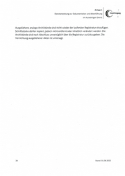 Anlage - Dienstanweisung zur Dokumentation und Aktenführung G- im Auswärtigen Dienst Ausgeliehene analoge Archivbände sind nicht wieder der laufenden Registratur einzufügen. Schriftstücke dürfen kopiert, jedoch nicht entfernt oder inhaltlich verändert werden. Die Archivbände sind nach Abschluss unverzüglich über die Registratur zurückzugeben. Die Vernichtung ausgeliehener Akten ist untersagt. 28 Stand: 01.08.2022