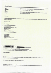 Hoog, Thomas Von: Olaf Scholz, MdB - Bundestagsbüro <olaf.scholz@bundestag.de> Gesendet: Donnerstag, 13. Januar 2022 18-31 An: bk01 Betreff: WG: Einladung Olaf Scholz: Keynote @ re:publica 2022, vom 8.-6. Juni 2022 Anlagen: rp22_Einladung_Scholz.pdf Liebe Kuk, hier noch eine Terminanfrage für die Teilnahme an der re:publica 2022, insbesondere zum Halten einer Keynote. Mit Bitte um Übernahme. Herzliche Grüße Bent Pollück Wissenschaftlicher Mitarbeiter Bundestagsbüro Olaf Scholz, MdB Platz der Republik 1 11011 Berlin Telefon: +49 30 227 72650 E-Mail: olaf.scholz@bundestag.de Wahlkreisbüro: Alleestraße 9 14469 Potsdam Telefon: +49 331 730 981 00 E-Mail: olaf.scholz.wk@bundestag.de Ursprüngliche Nachricht----- Von: RER (u [mailto e-pubtica.com) Gesendet: Donnerstag, 13. Januar 2022 18:00 An: Olaf Scholz, MdB — Bundestagsbüro <olaf.scholz@bundestag.de> Betreff: Einladung Olaf Scholz: Keynote @ re:publica 2022, vom 8.-6. Juni 2022 Hallo Zusammen, hiermit möchten wir Olaf Scholz ganz herzlich Einladen, eine Keynote auf der re:publica 2022 zum Stand der Digitalisierung in Deutschland zu halten. Die re:publica findet vom 8.-10. Juni 2022 in Berlin statt. Anbei finden Sie das PDF mit dem offiziellen Anschreiben, welches bereits postalisch im Dezember an das Bundeskanzleramt zugestellt wurde.