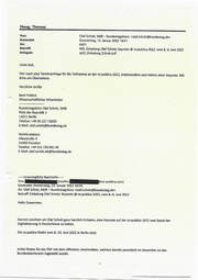 Hoog, Thomas Von: Olaf Scholz, MdB - Bundestagsbüro <olaf. de> Gesendet: Donnerstag, 13. Januar 2022 18:31 An: bk01 Betreff: WG: Einladung Olaf Scholz: Keynate @ re:publica 2022, vom 8.-6. Juni 2022 Anlagen: rp22_Einladung_Scholz.pdf Liebe KuK, hier noch eine Terminanfrage für die Teilnahme an der re:publica 2022, insbesondere zum Halten einer Keynote. Mit Bitte um Übernahme. ; Herzliche Grüße Bent Pollück Wissenschaftlicher Mitarbeiter Bundestagsbüro Olaf Scholz, MdB Platz der Republik 1 11011 Berlin Telefon: +49 30 227 72650 E-Mail: olaf.scholz@bundestag.de Wahlkreisbüro: Alleestraße 9 14469 Potsdam Telefon: +49 331 730 981 00 E-Mail: olaf.scholz.wk@bundestag.de -—--Ursprüngliche Nachricht--—- Von: [mai e-publica.com] Gesendet: Donnerstag, 13. Januar 2022 18:00 An: Olaf Scholz, MdB — Bundestagsbüro <olaf.scholz@bundestag.de> Betreff: Einladung Olaf Scholz: Keynote @ re:publica 2022, vom 8.-6. Juni 2022 Hallo Zusammen, hiermit möchten wir Olaf Scholz ganz herzlich Einladen, eine Keynote auf der re:publica 2022 zum Stand der Digitalisierung in Deutschland zu halten. Die re:publica findet vom 8.-10. Juni 2022 in Berlin statt. Anbei finden Sie das PDF mit dem offiziellen Anschreiben, welches bereits postalisch im Dezember an das ‚Bundeskanzleramt zugestellt wurde.
