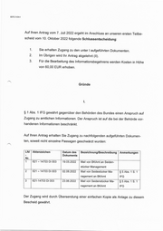 SEITE 2 VON 4 Auf Ihren Antrag vom 7. Juli 2022 ergeht im Anschluss an unseren ersten Teilbe- scheid vom 10. Oktober 2022 folgende Schlussentscheidung: $ 1 Abs. 1 IFG gewährt gegenüber den Behörden des Bundes einen Anspruch auf Zugang zu amtlichen Informationen. Der Anspruch ist auf die bei der Behörde vor- Sie erhalten Zugang zu den unter | aufgeführten Dokumenten. Im Übrigen wird Ihr Antrag abgelehnt (II). Für die Bearbeitung des Informationsbegehrens werden Kosten in Höhe von 60,00 EUR erhoben. handenen Informationen beschränkt. Gründe Auf Ihren Antrag erhalten Sie Zugang zu nachfolgenden aufgeführten Dokumen- ten, soweit nicht einzelne Passagen geschwärzt wurden: Lfd | Aktenzeichen Datum des | Bezeichnung/Beschreibung | Anmerkungen - Dokuments Nr. 1 621 - 14703 Di 003 19.05.2022 | Mail von BKAmt an Seiden- stücker Management 2 621 - 14703 Di 003 02.06.2022 | Mail von Seidestücker Ma- 85Abs.1S.1 nagement an BKAmt IFG 3 621-14703 Di 003 23.06.2022 | Mail von Seidenstücker Ma- 85Abs.1S. 1 nagement an BKAmt IFG Der Zugang wird durch Übersendung einer einfachen Kopie als Anlage zu diesem Bescheid gewährt.