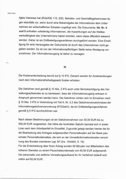 SEITE 4 VON 4 tigtes Interesse hat (BVerfGE 115, 205). Betriebs- und Geschäftsgeheimnisse lie- gen ebenfalls vor, wenn durch eine Bekanntgabe der Informationen dem Unter- nehmen ein wirtschaftlicher Schaden zugefügt wird. Die Dokumente, Ifd. Nr. 4 und 5 enthalten vollständig Informationen, die Auswirkungen auf die Wettbe- werbsfähigkeit des Unternehmens haben könnten, wenn diese öffentlich bekannt werden. Daher ist ein Drittbeteiligungsverfahren durchgeführt worden. Eine Einwil- ligung für eine Herausgabe der Dokumente ist durch das Unternehmen nicht ge- geben worden. Es ist von der informationspflichtigen Stelle keine Abwägung vor- zunehmen. Der Informationszugang ist daher zu versagen. Die Kostenentscheidung beruht auf $ 10 IFG. Danach werden für Amtshandlungen nach dem Informationsfreiheitsgesetz Kosten erhoben. Die Gebühren sind gemäß 8 10 Abs. 2 IFG auch unter Berücksichtigung des Ver- waltungsaufwandes so zu bemessen, dass der Informationszugang wirksam in Anspruch genommen werden kann. Die Gebühren richten sich im Einzelnen nach $ 10 Abs. 3 IFG in Verbindung mit Teil A, Nr. 2.2 des Gebührenverzeichnisses der Informationsgebührenverordnung (IFGGebV), da ein Drittbeteiligungsverfahren gemäß $ 8 IFG durchzuführen war. Nach diesen Bestimmungen ist ein Gebührenrahmen von 30,00 EUR bis zu 500,00 EUR vorgesehen. Die Höhe der konkreten Gebühr bemisst sich in erster Linie nach dem Arbeitsanfall im Einzelfall. Zugrunde gelegt werden hierbei die für die Bearbeitung des Antrages aufgewandten Personalkosten auf der Basis pau- schaler Personalkostensätze, die sich an der Umweltinformationskosten-verord- nung des Bundes orientieren (vgl. BT-Drs. 15/4493, S. 16). Für die Entscheidung über Ihren Antrag wurden 60 Minuten von Mitarbeitern des höheren Dienstes zu einem Pauschalstundensatz von 60,00 EUR aufgewandt. Der personelle und zeitliche Verwaltungsaufwand für Ihr Verfahren beläuft sich mithin auf 60,00 EUR.