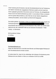 SEITE 5 VON 4 Unter Ausübung des Ermessens, das dem Bundeskanzleramt bei der Festsetzung der Gebühr innerhalb des vorgegebenen Rahmens zusteht und der Anzahl der Ihnen zugänglich gemachten Dokumente sowie der Prämisse, die antragstellende Person durch die Gebührenfestsetzung weder in unzumutbarer Weise zu belasten noch ein grobes Missverhältnis zu dem Wert der mit der Gebühr abgegoltenen Leistung herzustellen, wird die Gebühr auf 60,00 EUR festgesetzt. Sie werden gebeten, die Kosten in Höhe von insgesamt 60 EUR unter Angabe des Verwendungszwecks: innerhalb eines Monats nach Zustellung an die Bundeskasse Halle, IBAN: DE 38 8600 0000 0086 0010 40, BIC: MARKDEF1860 bei der Deutschen Bundesbank - Filiale Leipzig - zu überweisen. Mit freundlichen Grüßen Im Auftrag Rechtsbehelfsbelehrung: Gegen den Bescheid kann innerhalb eines Monats nach Bekanntgabe Widerspruch beim Bundeskanzleramt erhoben werden. Ich weise darauf hin, dass für die vollständige oder teilweise Zurückweisung eines Widerspruchs eine Gebühr in Höhe von mindestens 30,00 Euro anfällt.