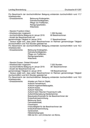 Landtag Brandenburg Drucksache 6/11297 Pro Bewohner/in der durchschnittlichen Belegung entstanden durchschnittlich rund 17,7 Arbeitsstunden. - Einsatzbereiche: Betreuung Kindergarten, Dolmetschertätigkeiten, Pflege von Freiflächen, Reinigungsarbeiten, Wäscherei. - Standort Frankfurt (Oder) - Arbeitsstunden insgesamt: 1.306 Stunden - durchschnittliche Belegung im Januar 2019: 80 Bewohner/innen - Anzahl der Bewohner/innen mit gemeinnütziger Tätigkeit im Januar 2019: 17 Bewohner/innen - Daraus ergibt sich, dass jede/r Bewohner/innen im Rahmen gemeinnütziger Tätigkeit durchschnittlich rund 76,8 Stunden geleistet hat. Pro Bewohner/in der durchschnittlichen Belegung entstanden durchschnittlich rund 16,3 Arbeitsstunden. - Einsatzbereiche: Betreuung Kindergarten, Dolmetschertätigkeiten, Pflege von Freiflächen, Reinigungsarbeiten, Wäscherei. - Standort Zossen, Ortsteil Wünsdorf - Arbeitsstunden insgesamt: 7.025 Stunden - durchschnittliche Belegung im Januar 2019: 361 Bewohner/innen - Anzahl der Bewohner/innen mit gemeinnütziger Tätigkeit im Januar 2019: 109 Bewohner/innen - Daraus ergibt sich, dass jede/r Bewohner/innen im Rahmen gemeinnütziger Tätigkeit durchschnittlich rund 64,5 Stunden geleistet hat. Pro Bewohner/in der durchschnittlichen Belegung entstanden durchschnittlich rund 19,5 Arbeitsstunden. - Einsatzbereiche: Arbeiten am Park im Objekt, Aufsicht Fernsehraum, Aufsicht Hygienemittelausgabe, Aufsicht Kasse, Aufsicht Teeküche, Aufsicht beim Räumen Frauenraum/-cafè, Aufsicht/Übersetzung Kleiderkammer, Beautysalon/Kosmetik für die Bewohner/innen der Erstaufnahmeeinrichtung, Betreuung Sport, Fahrradwerkstatt, Frauensport, Friseurtätigkeit für die Bewohner/innen der Erstaufnahmeeinrichtung, Gartenarbeit, Häkelarbeitsgruppe, Hilfe bei Ein- und Umräumen von Büros, -2-
