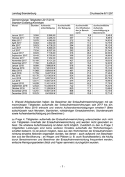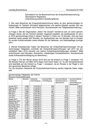 Landtag Brandenburg Drucksache 6/11297 6. Wahlperiode Antwort der Landesregierung auf die Kleine Anfrage Nr. 4493 der Abgeordneten Birgit Bessin (AfD-Fraktion) Drucksache 6/11028 Nachfrage zur Antwort der Landesregierung auf die Kleine Anfrage Nummer 4306 - Beschäftigung von Bewohnern der Brandenburger Erstaufnahmeeinrichtungen Namens der Landesregierung beantwortet der Minister des Innern und für Kommunales die Kleine Anfrage wie folgt: Vorbemerkungen der Fragestellerin: Nach Mitteilung der Landesregierung haben im Janu- ar 2019 insgesamt 378 Bewohner gemeinnützige Tätigkeiten an den Standorten der Erst- aufnahmeeinrichtung ausgeführt. Ferner gab es im Januar 2019 lediglich einen Einsatzbe- reich außerhalb der Erstaufnahmeeinrichtung, nämlich einen gemeinnützigen Arbeitsein- satz im Tierheim Wünsdorf. 1. Wieviel Arbeitsstunden haben die Bewohner der Erstaufnahmeeinrichtungen mit ge- meinnützigen Tätigkeiten innerhalb der Erstaufnahmeeinrichtungen im Januar 2019 ver- bracht? (Bitte aufschlüsseln nach Standorten, vollständigen Einsatzbereichen und Stun- denanzahl pro Bewohner.) zu Frage 1: Die Einsatzbereiche der Asylbewerberinnen und Asylbewerber für gemeinnüt- zige Tätigkeiten innerhalb der Erstaufnahmeeinrichtung sind vielfältig. Reinigungsleistun- gen werden neben den mit den Wohnheimbetreibern vertraglich festgelegten Reinigungs- leistungen durchgeführt. Betreuung und Aufsicht begründen sich in der Sprachmittlerfunk- tion zusätzlich zum vorhandenen Personal. Die einzelnen Einsatzbereiche pro Bewoh- ner/in werden im Zuge der Abrechnung nicht erfasst und sind somit nicht darstellbar. Ins- gesamt sind jedoch die im Folgenden genannten Einsatzbereiche bekannt. Für die einzel- nen Standorte der Erstaufnahmeeinrichtung werden folgende Daten mitgeteilt. Dabei wird für die Anzahl der Bewohner/innen mit gemeinnütziger Tätigkeit auf die Antwort zu den Fragen 2 und 3 der Kleinen Anfrage Nr. 4306 (Drucksache 6/10882) verwiesen. - Standort Eisenhüttenstadt - Arbeitsstunden insgesamt: 10.642 Stunden - durchschnittliche Belegung im Januar 2019: 600 Bewohner/innen - Anzahl der Bewohner/innen mit gemeinnütziger Tätigkeit im Januar 2019: 124 Bewohner/innen - Daraus ergibt sich, dass jede/r Bewohner/innen im Rahmen gemeinnütziger Tätigkeit durchschnittlich rund 85,8 Stunden geleistet hat. Eingegangen: 02.05.2019 / Ausgegeben: 07.05.2019