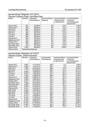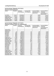 Landtag Brandenburg Drucksache 6/11297 Gemeinnützige Tätigkeiten 2017/2018 Standort Doberlug-Kirchhain Monat Stunden Aufwands- durchschnittli- durchschnittli- durchschnittliche entschädigung che Belegung che Arbeitsstun- Aufwands- den je Bewoh- entschädigung je ner/in Bewohner/in Januar 2017 3.584 2.866,80 523 6,8 5,48 € Februar 2017 4.108 3.286,40 367 11,2 8,96 € März 2017 5.076 4.060,80 272 18,7 14,93 € April 2017 4.303 3.442,00 250 17,2 13,75 € Mai 2017 5.923 4.738,20 294 20,2 16,12 € Juni 2017 7.113 5.690,20 304 23,4 18,70 € Juli 2017 7.534 6.027,00 282 26,7 21,34 € August 2017 8.923 7.138,60 316 28,2 22,59 € September 2017 8.445 6.755,60 358 23,6 18,89 € Oktober 2017 9.065 7.252,00 353 25,7 20,54 € November 2017 10.164 8.131,20 427 23,8 19,03 € Dezember 2017 7.760 6.208,20 501 15,5 12,40 € Januar 2018 9.584 7.666,80 € 576 16,6 13,31 € Februar 2018 9.316 7.453,00 € 493 18,9 15,13 € März 2018 11.068 8.854,40 € 461 24,0 19,20 € April 2018 11.759 9.407,20 € 538 21,9 17,48 € Mai 2018 15.170 12.136,00 € 524 29,0 23,18 € Juni 2018 12.447 9.957,60 € 479 26,0 20,79 € Juli 2018 13.571 10.857,00 € 544 24,9 19,96 € August 2018 14.289 11.431,40 € 643 22,2 17,78 € September 2018 12.923 10.338,40 € 722 17,9 14,33 € Oktober 2018 14.101 11.280,80 € 825 17,1 13,68 € November 2018 13.251 10.601,00 € 806 16,4 13,15 € Dezember 2018 10.523 8.418,60 € 662 15,9 12,71 € 4. Wieviel Arbeitsstunden haben die Bewohner der Erstaufnahmeeinrichtungen mit ge- meinnützigen Tätigkeiten außerhalb der Erstaufnahmeeinrichtungen seit 2017 bis ein- schließlich März 2019 erbracht und welche Aufwandsentschädigungen erhalten? (Bitte aufschlüsseln nach Monaten, Standorten, vollständigen Einsatzbereichen, Stundenanzahl sowie Aufwandsentschädigung pro Bewohner.) zu Frage 4: Tätigkeiten außerhalb der Erstaufnahmeeinrichtung unterscheiden sich nicht von Tätigkeiten innerhalb der Erstaufnahmeeinrichtung und werden nicht gesondert er- fasst. Die erbetene Aufschlüsselung ist daher nicht möglich. Zusätzlich zu den zu Frage 2 mitgeteilten Leistungen sind keine weiteren Einsätze außerhalb der Wohnheimliegen- schaften bekannt. Es ist jedoch möglich, dass aus den Wohnheimen der Erstaufnahmeein- richtung einzelne Aktionen organisiert wurden, bei denen - auch aufgrund von Beschwer- den aus der Bevölkerung - an Wegen und Plätzen (z. B. auch Bushaltestellen), die häufig durch Bewohnerinnen und Bewohner der Erstaufnahmeeinrichtung frequentiert werden, einfache Reinigungsarbeiten (Müll und Papier sammeln) durchgeführt wurden. -7-