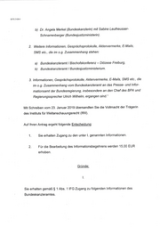 SEITEZVON4 b) Dr. Angela Merkel (Bundeskanzlerin) mit Sabine Leutheusser- Schnarrenberger (Bundesjustizministerin). 2. Weitere Informationen, Gesprächsprotokolle, Aktenvermerke, E-Mails, SMS etc., die im o.g. Zusammenhang stehen: a) Bundeskanzleramt / Bischofskonferenz — Diözese Freiburg, b) Bundeskanzleramt / Bundesjustizministerium. 3. Informationen, Gesprächsprotokolle, Aktenvermerke, E-Mails, SMS etc., die im 0.g. Zusammenhang vom Bundeskanzleramt an das Presse- und Infor- mationsamt der Bundesregierung, insbesondere an den Chef des BPA und Regierungssprecher Ulrich Wilhelm, ergangen sind.” Mit Schreiben vom 23. Januar 2019 übersandten Sie die Vollmacht der Trägerin des Instituts für Weltanschauungsrecht (IfW). Auf Ihren Antrag ergeht folgende Entscheidung: 1; Sie erhalten Zugang zu den unter I. genannten Informationen. 5 Für die Bearbeitung des Informationsbegehrens werden 15,00 EUR erhoben. Gründe: Sie erhalten gemäß 8 1 Abs. 1 IFG Zugang zu folgenden Informationen des Bundeskanzleramtes.
