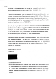 SEITE 4 VON 4 pauschaler Personalkostensätze, die sich an der Umweltinformationskosten- verordnung des Bundes orientieren (vgl. BT-Drs. 15/4493, S. 16). Für die Entscheidung über Ihren Antrag wurden 60 Minuten von Mitarbeitern des höheren Dienstes zu einem Pauschalstundensatz von 60,00 EUR und 30 Minuten von Mitarbeitern des gehobenen Dienstes zu einem Pauschalstundensatz von 45,00 EUR aufgewandt. Der personelle und zeitliche Verwaltungsaufwand für Ihr Verfahren beläuft sich mithin auf 82,50 EUR. Unter Ausübung des Ermessens, das dem Bundeskanzleramt bei der Festsetzung der Gebühr innerhalb des vorgegebenen Rahmens zusteht und unter der Berück- sichtigung der Anzahl der Dokumente, zu denen Ihnen Zugang gewährt wird, als auch unter Beachtung Ihres journalistischen und öffentlichen Interesses an der Auskunftserteilung, wird die Gebühr auf 15,00 EUR festgesetzt. Sie werden gebeten, die Kosten in Höhe von insgesamt 15,00 EUR unter Angabe des Verwendungszwecks: 1180 0447 9370, „IFG-Antrag 2019, NA 021“ innerhalb eines Monats nach Zustellung an die Bundeskasse Halle, IBAN: DE 38 8600 0000 0086 0010 40, BIC: MARKDEF 1860 bei der Deutschen Bundesbank - Filiale Leipzig - zu überweisen. Mit freundlichen Grüßen Im Auftrag Rechtsbehelfsbelehrung: Gegen diesen Bescheid kann innerhalb eines Monats nach Bekanntgabe schrift- lich oder zur Niederschrift Widerspruch beim Bundeskanzleramt, Willy-Brandt- Str. 1, 10557 Berlin erhoben werden. Ich weise darauf hin, dass für die vollstän- dige oder teilweise Zurückweisung eines Widerspruchs Kosten von 30,00 EUR anfallen.
