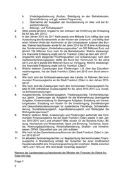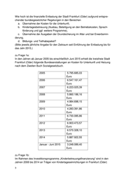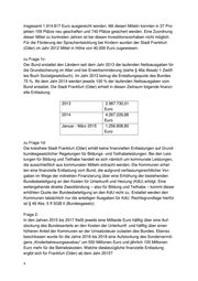 insgesamt 1.914.817 Euro ausgereicht worden. Mit diesen Mitteln konnten in 37 Pro- jekten 109 Plätze neu geschaffen und 740 Plätze gesichert werden. Eine Zuordnung dieser Mittel zu konkreten Jahren ist bei diesen Investitionsvorhaben nicht möglich. Für die Förderung der Sprachentwicklung bei Kindern wurden der Stadt Frankfurt (Oder) im Jahr 2012 Mittel in Höhe von 40.000 Euro zugewiesen. zu Frage 1c: Der Bund erstattet den Ländern seit dem Jahr 2013 die laufenden Nettoausgaben für die Grundsicherung im Alter und bei Erwerbsminderung (siehe § 46a Absatz 1 Zwölf- tes Buch Sozialgesetzbuch). Im Jahr 2013 betrug die Erstattungsquote des Bundes 75 %. Ab dem Jahr 2014 werden jeweils 100 % der laufenden Nettoausgaben vom Bund erstattet. Die Stadt Frankfurt (Oder) erhielt in diesen Zeitraum folgende finanzi- elle Entlastung: 2013 2.987.730,01 Euro 2014 4.267.226,88 Euro Januar - März 2015 1.256.808,80 Euro zu Frage 1d: Die kreisfreie Stadt Frankfurt (Oder) erhält keine finanziellen Entlastungen auf Grund bundesgesetzlicher Regelungen für Bildungs- und Teilhabeleistungen. Bei den Leis- tungen für Bildung und Teilhabe handelt es sich nämlich um kommunale Leistungen, die ausschließlich aus kommunalen Mitteln erbracht werden. Die Kommunen erhal- ten eine finanzielle Entlastung vom Bund, die aufgrund verfassungsrechtlicher Vor- gaben im Wege der indirekten Finanzierung über eine Erhöhung der bestehenden Bundesbeteiligung an den Kosten für Unterkunft und Heizung (KdU) erfolgt. Eine weitergehende direkte Zweckbindung – also für Bildung und Teilhabe – kommt dieser erhöhten Quote der Bundesbeteiligung an den KdU nicht zu. Erstattet werden den Kommunen tatsächlich nur die anteiligen Ausgaben für KdU. Rechtsgrundlage hierfür ist § 46 Abs. 5 ff SGB II (Bundesgesetz). Frage 2: In den Jahren 2015 bis 2017 fließt jeweils eine Milliarde Euro hälftig über eine Auf- stockung des Bundesanteils an den Kosten der Unterkunft und hälftig über einen höheren Anteil der Kommunen an der Umsatzsteuer zulasten des Bundes. Ebenso beschlossen wurde für die Jahre 2016 bis 2018 eine Aufstockung des Sondervermö- gens „Kinderbetreuungsausbau“ um 550 Millionen Euro und jährlich 100 Millionen Euro mehr für die Betriebskosten. Welche diesbezügliche finanzielle Entlastung ergibt sich für Frankfurt (Oder) ab dem Jahr 2015?