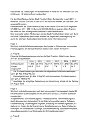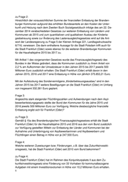 Landtag Brandenburg Drucksache 6/2106 6. Wahlperiode Antwort der Landesregierung auf die Kleine Anfrage 747 des Abgeordneten René Wilke der Fraktion DIE LINKE Drucksache 6/1774 Finanzausstattung der kreisfreien Stadt Frankfurt (Oder) Wortlaut der Kleinen Anfrage 747 vom 17.06.2015 Die Kommunen sind hauptzuständig für die soziale Infrastruktur der Gesellschaft und für die Daseinsvorsorge der Bürgerinnen und Bürger. In ihre Verantwortung fällt die Sicherstellung eines bedarfsgerechten und bürgernahen Angebots an sozialen Ein- richtungen und Dienstleistungen. Zu den wichtigsten Aufgaben zählen soziale Leis- tungen, Kultur, Gesundheit, Sport und Erholung, Straßenbau und Verkehrswesen, Energie- und Wasserversorgung, Stadtreinigung, öffentliche Ordnung, Bau- und Wohnungswesen sowie Wirtschaftsförderung. Gleichwohl bedürfen handlungsfähige Kommunen einer soliden Finanzausstattung. Jene ist in vielen Kommunen über die Jahre verloren gegangen. So benötigt auch Frankfurt (Oder) ein Haushaltssiche- rungskonzept. Die Bertelsmann-Stiftung hat am 08. Juni 2015 eine Studie zur kom- munalen Entlastung von Sozialausgaben vorgestellt. Die Stiftung benennt die immer weiter steigenden Sozialausgaben als Ursache für die kommunalen Finanzprobleme. Die Entlastung der Kommunen von bestimmten sozialen Ausgaben aus dem Bun- deshaushalt ist der richtige Weg, den besonders betroffenen strukturschwachen Kommunen zu helfen. Die Reihe einschlägiger Entlastungen begann mit dem SGB II, welches 2005 in Kraft trat. Daneben gab es weitere Finanzströme z.B. im Zuge der Konjunkturpakete. Auch im Rahmen des Kommunalen Finanzausgleichs werden Frankfurt (Oder) jähr- lich Mittel vom Land zugewiesen. Darüber hinaus werden mit diversen Förderpro- grammen landesseitig Vorhaben und Projekt unterstützt und Entwicklungen vorange- trieben. Ich frage die Landesregierung: 1. Wie hoch ist die finanzielle Entlastung der Stadt Frankfurt (Oder) aufgrund entsprechender bundesgesetzlicher Regelungen in den Bereichen a. Übernahme der Kosten für die Unterkunft,