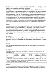 b. Kindertagesbetreuung (Ausbau, Beteiligung an den Betriebskosten, Sprachförderung und ggf. weitere Programme), c. Übernahme der Ausgaben der Grundsicherung im Alter und bei Er- werbsminderung, d. Bildungs- und Teilhabepaket? 2. (Bitte jeweils jährliche Angabe für den Zeitraum seit Einführung der Entlastung bis für das Jahr 2015.) 3. In den Jahren 2015 bis 2017 fließt jeweils eine Milliarde Euro hälftig über eine Aufstockung des Bundesanteils an den Kosten der Unterkunft und hälftig über einen höheren Anteil der Kommunen an der Umsatzsteuer zulasten des Bun- des. Ebenso beschlossen wurde für die Jahre 2016 bis 2018 eine Aufstockung des Sondervermögens „Kinderbetreuungsausbau“ um 550 Millionen Euro und jährlich 100 Millionen Euro mehr für die Betriebskosten. Welche diesbezügli- che finanzielle Entlastung ergibt sich für Frankfurt (Oder) ab dem Jahr 2015? 4. Angesichts stark steigender Flüchtlingszahlen und Aufwendungen nach dem Asylbewerberleistungsgesetz stellte der Bund den Kommunen für die Jahre 2015 und 2016 jeweils 500 Millionen Euro zur Verfügung. Welche diesbezügli- che finanzielle Entlastung ergibt sich für Frankfurt (Oder)? 5. Welche weiteren Zuweisungen bzw. Förderungen, z.B. über das Zukunftsin- vestitionsgesetz, hat die Stadt Frankfurt (Oder) seit 2010 vom Bund bekom- men? 6. Wie hoch sind die Schlüsselzuweisungen des Landes im Rahmen des kom- munalen Finanzausgleichs an die Stadt Frankfurt (Oder) in den Jahren 2010- 2015? 7. Wie hoch sind die Zuweisungen nach dem kommunalen Finanzausgleich Ka- pitel 20 030 enthaltenen Zuweisungstitel für die Jahre 2010-2015 (u.a. investi- ve Schlüsselzuweisungen, 8. Ausgleichsfonds, Schullastenausgleich, Theaterpauschale, Familienleistungs- aus gleich, Zuweisungen als Ausgleich für die Wahrnehmung übertragener Aufgaben, Kostenerstattung für übertragene Aufgaben, Erstattung von Verwal- tungskosten, Erstattung von Kosten für die Unterbringung, Sozialleistungen und Gesundheitsuntersuchungen für ausländische Flüchtlinge, Schülerbeför- derung, Soziallastenausgleich, Jugendlastenausgleich und Weitergabe der Wohngeldersparnisse)? 9. Welche weiteren Mittel, Zuweisungen und Förderungen außerhalb des Kom- munalen Finanzausgleichs hat die Stadt Frankfurt (Oder) jeweils in den Jah- ren 2010-2015 vom Land erhalten? Bitte einzeln für die Bereiche Kultur, Bil- dung, Hochschule und Wissenschaft, Sport und Erholung, Tourismus, Sozia- les, Wohnungsbauförderung, Wirtschaftsförderung, Straßen- und Verkehrs- wesen, ÖPNV, Gesundheit usw. pro Jahr auflisten 10. Wie hoch ist das Gewerbesteueraufkommen der Stadt Frankfurt (Oder) in Jah- ren 2010-2014? 11. Im aktuellen Symmetriegutachten zur Begutachtung des kommunalen Finanz- ausgleichs in Brandenburg schlägt der Gutachter bei einer modifizierten Hauptansatzstaffel eine Einwohnergewichtung der kreisfreien Städte zwischen 160% und 170% vor. Wie wird dieser Vorschlag bewertet? Namens der Landesregierung beantwortet der Minister der Finanzen die Kleine An- frage wie folgt: Frage 1: