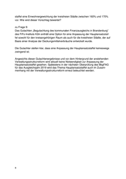 staffel eine Einwohnergewichtung der kreisfreien Städte zwischen 160% und 170% vor. Wie wird dieser Vorschlag bewertet? zu Frage 9: Das Gutachten „Begutachtung des kommunalen Finanzausgleichs in Brandenburg“ des FiFo-Instituts Köln enthält eine Option für eine Anpassung der Hauptansatzstaf- fel sowohl für den kreisangehörigen Raum als auch für die kreisfreien Städte, der auf Basis einer Analyse der Deckungsmittelverbräuche entwickelt wurde. Die Gutachter stellen klar, dass eine Anpassung der Hauptansatzstaffel keineswegs zwingend ist. Angesichts dieser Gutachtenergebnisse und vor dem Hintergrund der anstehenden Verwaltungsstrukturreform wird aktuell keine Notwendigkeit zur Anpassung der Hauptansatzstaffel gesehen. Spätestens in der nächsten Überprüfung des BbgFAG für das Ausgleichsjahr 2019 wird das Thema Hauptansatzstaffel auch im Zusam- menhang mit der Verwaltungsstrukturreform erneut beleuchtet werden.